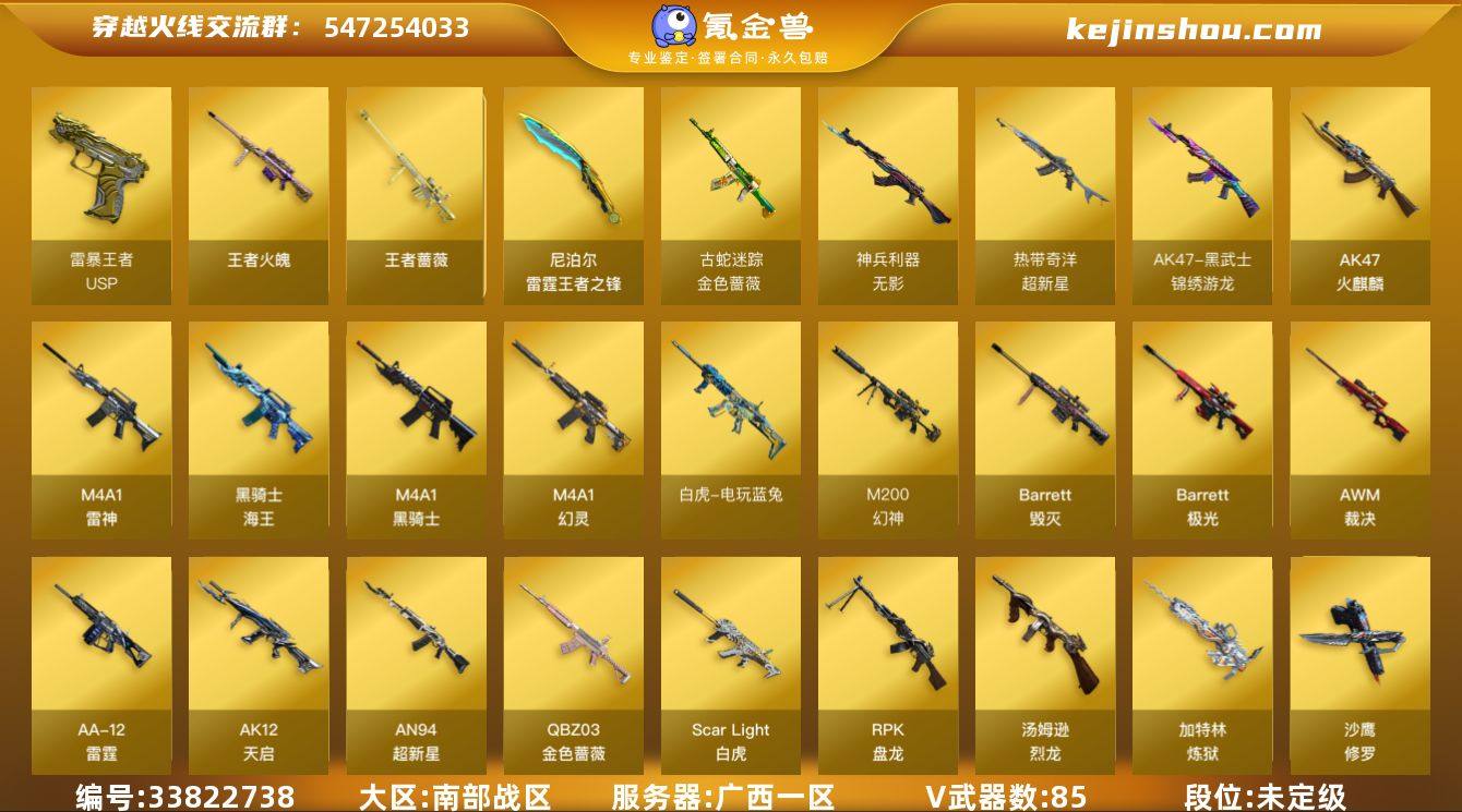广西一区-104V-27王者武器数-0炫金武器数 【传说角色】:传说艾莉莎,传说影煞 【热门武器】:G36C-幻影,QBZ03-金色蔷薇,Scar Light-白虎,M4A1-青龙,M200-幻神,金色蔷薇-古蛇迷踪,修罗-古蛇迷踪,白虎-电玩蓝兔,Cat-刀锋,M4A1-黑骑士,汤姆逊-烈龙*6,RPK-盘龙*5,加特林-炼狱,斯泰尔-蝴蝶,沙鹰-修罗*2 【王者炫金武器】:王者火魄,王者蔷薇,USP-雷暴王者,雷霆王者之锋*3,王者冰锋,高爆手雷-雷霆王者*5 【音效卡】:屠龙-电竞之星-竞星跃动音效卡,M4A1-黑骑士音效卡,Barrett-毁灭音效卡,Barrett-极光音效卡,AWM-裁决音效卡,Scar Light-白虎音效卡,HK417-朱雀-电竞之星-竞星跃动音效卡,Barrett-碧霄极光音效卡,炼狱-百战金芒-庆典舞曲音效卡,死神-雪域霜狐-怀旧音效卡,天罚-斗烈龙驹-斗烈音效卡,屠龙-斗烈龙驹-斗烈音效卡 【皮肤】:裁决-叶芒苍灵 皮肤,裁决-运输船 皮肤,白虎-传奇常旭 皮肤,QBZ03-荣耀世冠EP 皮肤,金色蔷薇-电竞之星 皮肤,雷神-荣耀之魄,雷神-虎将,雷神-宇航兔皮肤,雷神-梦蝶 皮肤,雷神-源计划2.0专属 皮肤,M4A1-再燃火线,炼狱-酷酷小狮,火麒麟-平天大圣,火麒麟-心动糖果,毁灭-暗月,毁灭-BEAN-2020MVP,毁灭-神秘黑...