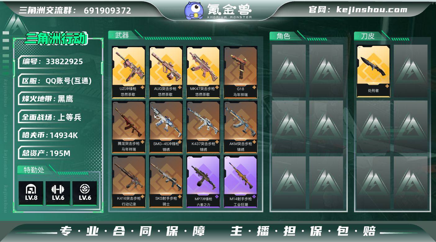 【PTSJZ4078】总资产195M/哈夫币1493万/传说近战数1/传说枪皮数10/战场等级26/行动等级60/安全箱等时效性道具以游戏内数据为准,详情请看图/近战-处刑者/近战-黑鹰/AKM突击步枪-锦绣/K416突击步枪-行动记录/AUG突击步枪-悠然茶歇/腾龙突击步枪-马年祥瑞/K437突击步枪-锦绣/MK47突击步枪-悠然茶歇/UZI冲锋枪-悠然茶歇/SMG-45冲锋枪-锦绣/SKS射手步枪-骑士/G18-马年祥瑞/K416突击步枪-冬日风情/SG552突击步枪-哈夫克警备/MP5冲锋枪-竞技风/勇士冲锋枪-深海恐惧/MP7冲锋枪-六套之力/QJB201轻机枪-炽焰/M14射手步枪-工业狂潮/SV-98狙击步枪-囚徒/SV98狙击步枪-猎鳄行动/SG552突击步枪-巨兽/M4A1突击步枪-千里骏骨/AKM突击步枪-肃杀/K416突击步枪-一帆风顺/M7战斗步枪-前沿科技/SG552突击步枪-2026/SG552突击步枪-贴花艺术/ AK-12突击步枪-马年新春/SCAR-H战斗步枪-荣耀列队/MK47突击步枪-冰河潜伏者/MP5冲锋枪-弄臣/Vector冲锋枪-先锋/勇士冲锋枪-冰天雪地/M249轻机枪-冰天雪地/Mini-14射手步枪-荣耀列队/SKS射手步枪-弄臣/QSZ92G-一帆风顺/G18-星链科技/G18-哈夫克航天/PKM通用机枪-黄铜/勇士冲锋枪-旧工业/VSS射手步枪-噬菌体/SMG-45冲锋枪-斑马/R93狙击步枪-斑马/M4A1突击步枪-...