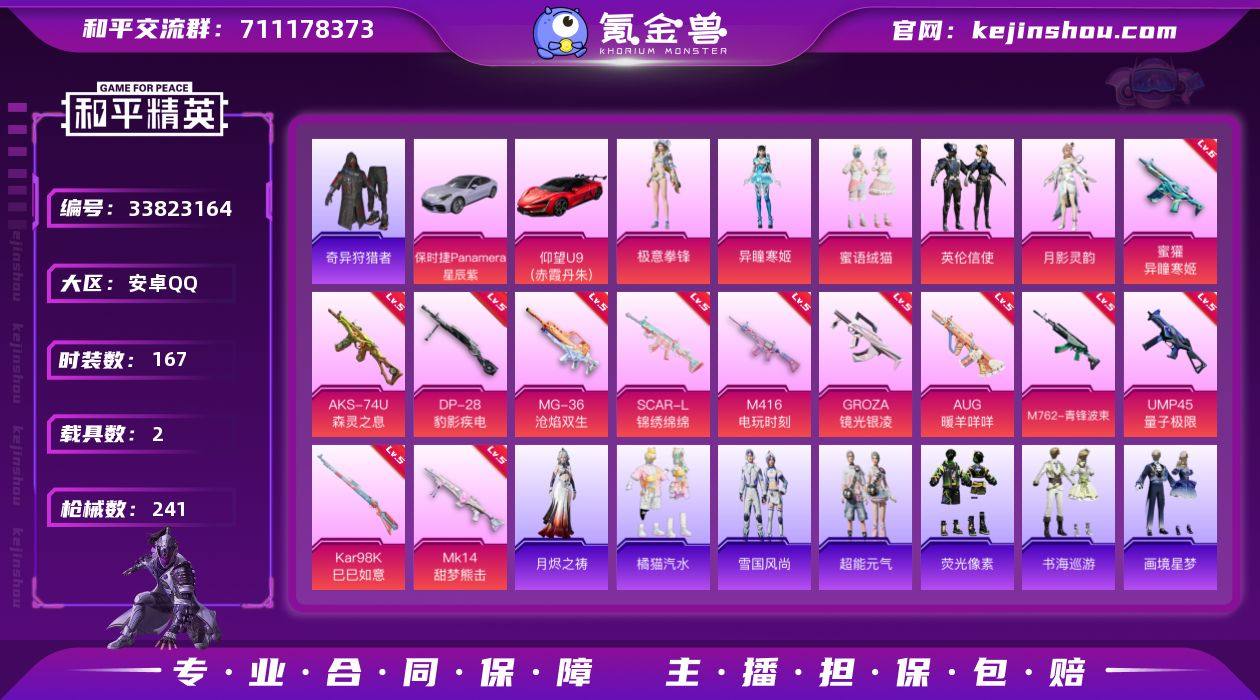 安卓 手Q-5粉装-12特效枪-2载具-4粉色飞行器-74651热力值-11王牌印记-167套装-241枪皮 【热门品类】:套装-奇异狩猎者,套装-龟仙人,套装-暗影哥特,套装-粉红小猪 【粉色套装】:粉装-蜜语绒猫,粉装-英伦信使,角色-月影灵韵,角色-异瞳寒姬,粉装-极意拳锋 【粉色枪皮等级】:SCAR-L-锦绣绵绵(五级),M416-电玩时刻(五级),GROZA-镜光银凌(五级),AUG-暖羊咩咩(五级),M762-青锋波束(五级),蜜獾-异瞳寒姬(六级),UMP45-量子极限(五级),AKS-74U-森灵之息(五级),Kar98K-巳巳如意(五级),Mk14-甜梦熊击(五级),DP-28-豹影疾电(五级),MG-36-沧焰双生(五级) 【粉色载具】:仰望U9(赤霞丹朱),保时捷Panamera(星辰紫) 【粉色枪皮】:SCAR-L-锦绣绵绵,M416-电玩时刻,GROZA-镜光银凌,AUG-暖羊咩咩,M762-青锋波束,蜜獾-异瞳寒姬,UMP45-量子极限,AKS-74U-森灵之息,Kar98K-巳巳如意,Mk14-甜梦熊击,DP-28-豹影疾电,MG-36-沧焰双生 【粉色飞行器】:庄周梦蝶飞行器,绝色倾城飞行器,极意拳锋飞行器 【粉色降落伞】:绝对恒星降落伞,风花雪月降落伞,庄周梦蝶降落伞,拂晓神骑降落伞,超新星降落伞,莲影清波降落伞,月影灵韵降落伞,樱桃泡泡降落伞,星穹咏叹调降...