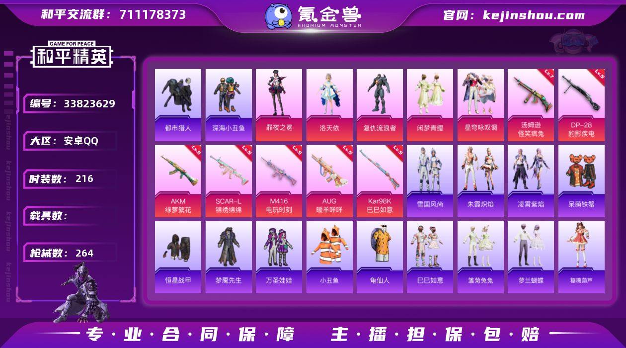 安卓 手Q-5粉装-7特效枪-0载具-2粉色飞行器-80083热力值-14王牌印记-216套装-264枪皮 【热门品类】:套装-都市猎人,套装-深海小丑鱼,套装-小丑鱼,套装-龟仙人 【粉色套装】:角色-洛天依,角色-复仇流浪者,粉装-闲梦青缨,粉装-星穹咏叹调,角色-罪夜之冕 【粉色枪皮等级】:AKM-绿萝繁花(五级),SCAR-L-锦绣绵绵(五级),M416-电玩时刻(五级),AUG-暖羊咩咩(五级),汤姆逊-怪笑疯兔(七级),Kar98K-巳巳如意(五级),DP-28-豹影疾电(五级) 【粉色枪皮】:AKM-绿萝繁花,SCAR-L-锦绣绵绵,M416-电玩时刻,AUG-暖羊咩咩,汤姆逊-怪笑疯兔,Kar98K-巳巳如意,DP-28-豹影疾电 【粉色飞行器】:齐天大圣飞行器,绝色倾城飞行器 【粉色降落伞】:金风玉露降落伞,神秘黑猫降落伞,马卡龙降落伞,暗夜玫瑰降落伞,齐天大圣降落伞,临安公主降落伞,星穹咏叹调降落伞,辉羽雀灵降落伞,湮灭星辰降落伞,幻星舰长降落伞,幻彩电音降落伞,时光之吻降落伞,炫彩糖果降落伞 【稀有套装】:套装-龟仙人,套装-巳巳如意,套装-雪国风尚,套装-雏菊兔兔,套装-萝兰蝴蝶,套装-糖糖葫芦,套装-青团波波,套装-燕燕于飞,套装-鱼渊荷华,角色-风玲,套装-旋风灵鼠,套装-粉恋花,套装-紫幽梦...
