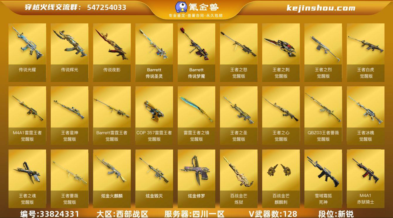 【C6929】四川一区-159V-24王者武器数-3炫金武器数 【传说武器】:传说光耀(序列号版),传说光耀,传说辉光,传说夜影,传说圣灵,传说梦魇 【传说角色】:传说女帝,传说艾莉莎 【热门武器】:传说光耀,传说梦魇,传说圣灵,传说夜影,传说辉光,G36C-幻影,QBZ03-金色蔷薇,M14EBR-玄武,HK417-朱雀,M4A1-青龙,M200-幻神,金色蔷薇-古蛇迷踪,修罗-古蛇迷踪,M200-竞技荣光,八面凌龙,死亡之眼,荣耀世冠-火麒麟,荣耀世冠-雷神,白虎-电玩蓝兔,柯尔特-冠军之特,荣耀世冠-柯尔特,毒蜂,M4A1-黑骑士*4,汤姆逊-烈龙*6,RPK-盘龙*6,加特林-炼狱,斯泰尔-蝴蝶,USP-雷暴,沙鹰-修罗*2,Knife-冠军之刃,炽芒蝶刃*2,炽芒蝶刃-破浪逐光 皮肤,荣耀世冠-龙啸*2,黄金猫猫手套-白鲨 【王者炫金武器】:高爆手雷-雷霆王者*2,炫金火麒麟,炫金毁灭,炫金修罗 【音效卡】:屠龙-动感闪耀 音效卡,M4A1-黑骑士音效卡,炼狱-百战金芒-庆典舞曲音效卡,死神-雪域霜狐-怀旧音效卡,枪娘语音包-阿敏 【皮肤】:幻神-丹凤,幻神-电流骇客 皮肤,QBZ03-冠军之薇,金色蔷薇-破浪逐光 皮肤,雷神-冠军之魄,雷神-荣耀世冠AG,雷神-动感闪耀 皮肤,雷神-源计划2.0专属 皮肤,M4A1-再...