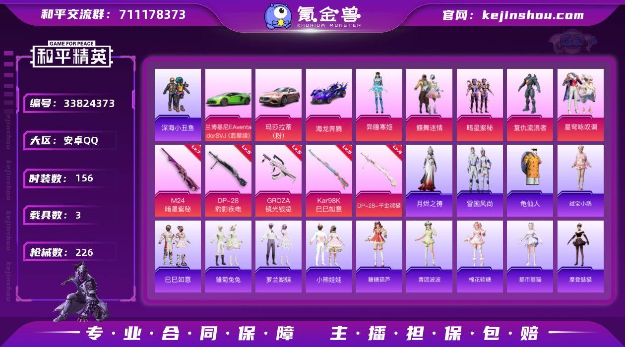 【kyhp237】安卓 手Q-5粉装-5特效枪-3载具-4粉色飞行器-66652热力值-4王牌印记-156套装-226枪皮 【热门品类】:套装-深海小丑鱼,套装-龟仙人 【粉色套装】:粉装-蝶舞迷情,粉装-暗星紫秘,角色-复仇流浪者,粉装-星穹咏叹调,角色-异瞳寒姬 【粉色枪皮等级】:GROZA-镜光银凌(五级),Kar98K-巳巳如意(五级),M24-暗星紫秘(七级),DP-28-千金淑猫(四级),DP-28-豹影疾电(五级) 【粉色载具】:兰博基尼Aventador SVJ(翡翠绿),玛莎拉蒂Ghibli(粉),海龙奔腾 【粉色枪皮】:GROZA-镜光银凌,Kar98K-巳巳如意,M24-暗星紫秘,DP-28-千金淑猫,DP-28-豹影疾电 【粉色飞行器】:春暖花开飞行器,天之羽翼飞行器,极意拳锋飞行器 【粉色降落伞】:春暖花开降落伞,梦幻火箭降落伞,银刃赛罗降落伞,暗星紫秘降落伞,碧影闪光降落伞,恐龙拽拽降落伞,垂柳戏鸭降落伞,精灵梦叶罗丽降落伞,拳皇·狂花道降落伞,千金淑猫降落伞,星穹咏叹调降落伞,幻彩电音降落伞,异瞳寒姬降落伞,炫彩糖果降落伞 【稀有套装】:套装-龟仙人,套装-绒宝小鹅,套装-巳巳如意,套装-雪国风尚,套装-炫彩糖果,套装-雏菊兔兔,套装-萝兰蝴蝶,套装-小熊娃娃,套装-糖糖葫芦,套装-青团波波,套装-...