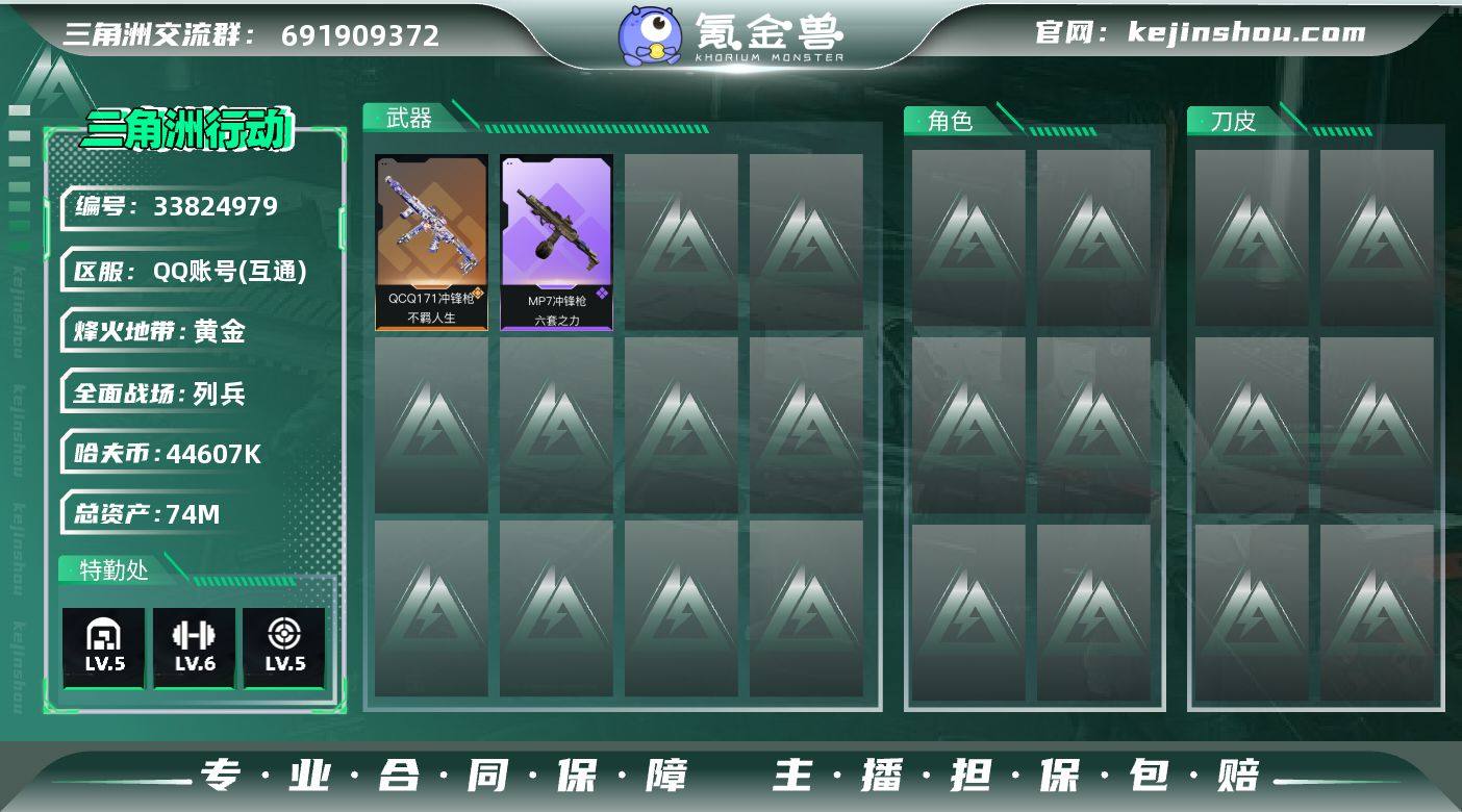 【LSJX984】74m总资产-44607k哈夫币-51烽火等级-黄金-11战场等级-列兵 【近战皮肤】:近战-黑鹰 【传说外观】:QCQ171冲锋枪-不羁人生 【史诗外观】:MP7冲锋枪-六套之力 【稀有外观】: AK-12突击步枪-马年新春,SKS射手步枪-弄臣 【普通外观】:腾龙突击步枪-三角洲力量,PTR-32突击步枪-黄蜂,CAR-15突击步枪-狂欢,MP5冲锋枪-黄蜂,P90冲锋枪-黑巧甜心,UZI冲锋枪-狂欢,野牛冲锋枪-高雅黑,M1014霰弹枪-重击,杠杆式步枪-出货,QJB201轻机枪-典雅,SR9射手步枪-出货,SV-98狙击步枪-红色涂装,沙漠之鹰-海浪 【挂饰】:挂饰-福禄*2,挂饰-聚宝盆*3,挂饰-不羁人生,挂饰-麻将*14,挂饰-星象仪