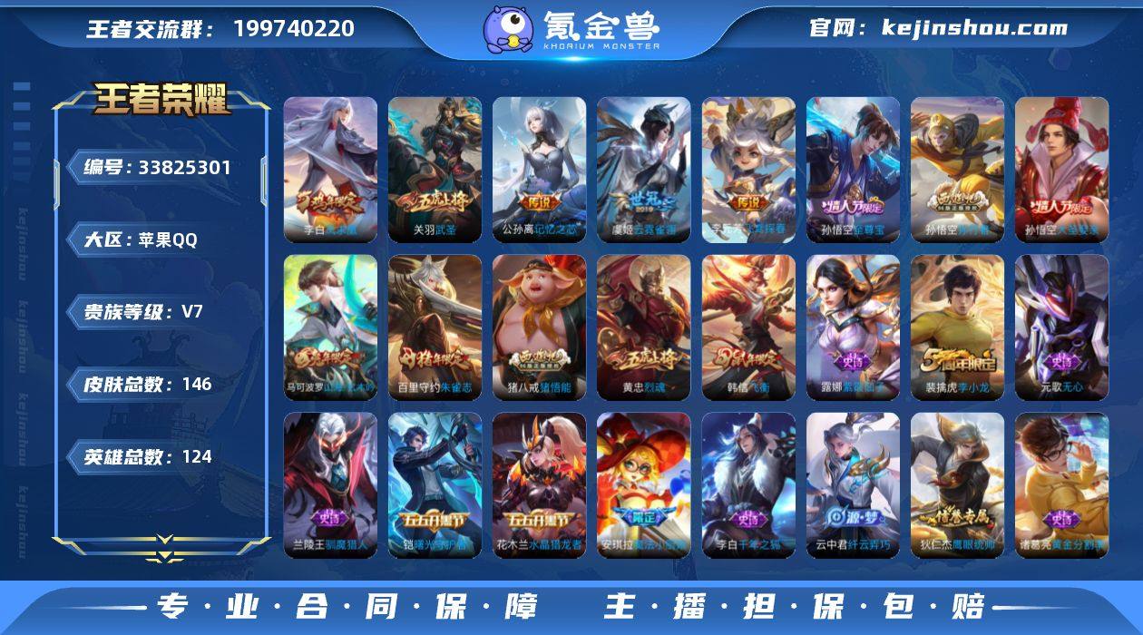 实名: 可修改 性别: 女号 贵族等级: V7 英雄数: 124 皮肤数: 146 传说皮: 云霓雀翎,飞鸢探春,记忆之芯 限定皮: 李小龙,梁祝,武圣,烈魂,魔法小厨娘,飞衡,凤求凰,朱雀志,至尊宝,大圣娶亲,孙行者,猪悟能,山海·玄木吟 亮点: 【优质装备】:云霓雀翎,飞鸢探春,记忆之芯(机甲兔)