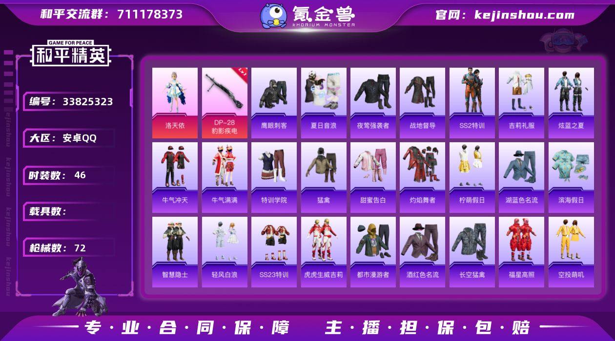 【洛天依 1粉装1特效枪 可秒换绑不用等】 安卓Q区-17809热力值-46套装-72枪皮 【1粉装】 洛天依【1特效枪】 DP-28-豹影疾电(1级)【17热门】 M416-蓝色火焰 GROZA-彩虹符号 QBZ-银碳小老虎 长空猛禽 牛气冲天 鹰眼刺客 SS23特训 SS22特训 SCAR-L-玉兔迎春 M762-天降萌叽 Mk47-乌木金纹 UMP45-蓝色火焰 MG3-幻世战舞者 AKM-虎虎生威 AKM-霓虹街区【1飞行器】 红色滑翔尾迹 营地ID:1045571442