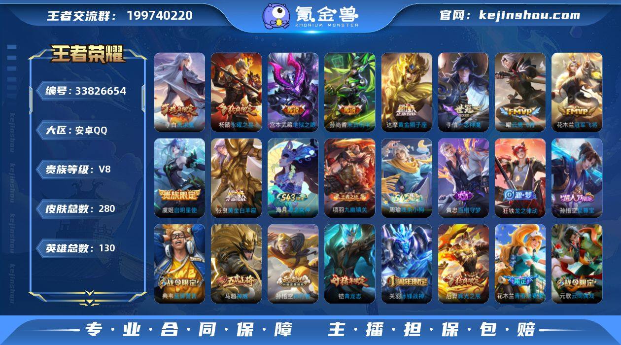 安卓Q-V8-至尊星耀III段位-130英雄-280皮肤-1典藏英雄-10传说-94史诗 【英雄全皮】:空空儿全皮 【荣耀典藏】:武则天英雄 【传说皮肤】:虞姬启明星使,曜云鹰飞将,李信一念神魔,张良黄金白羊座,达摩黄金狮子座,花木兰冠军飞将,杨戬永曜之星,李白凤求凰,孙尚香末日机甲,宫本武藏地狱之眼 【限定皮肤】:白起狰,姜子牙天穹之誓,狄仁杰阴阳师,虞姬凯尔特女王,赵云皇家上将,赵云引擎之心,墨子神迹守卫,嬴政优雅恋人,鲁班七号狮舞东方,庄周高山流水,高渐离死亡摇滚,阿轲迷踪丽影,孙膑天狼运算者,扁鹊炼金王,白起夜都怪侠,芈月重明,芈月幻夜卜梦,吕布猎兽之王,周瑜赤莲之焰,元歌云间偶戏,元歌无心,夏侯惇朔风刀,甄姬游园惊梦,曹操烛龙,典韦穷奇,典韦蓝屏警告,马可波罗逐梦之星,狄仁杰魔术师,狄仁杰万华元夜,达摩星际陆战队,达摩沙漠行僧,项羽海滩派对,老夫子醍醐杖,老夫子航海奇遇记,关羽冰锋战神,程咬金演武夺筹,刘邦夺宝奇兵,韩信飞衡,兰陵王驯魔猎人,兰陵王金庭之子,花木兰青春决赛季,亚瑟潮玩骑士王,孙悟空至尊宝,孙悟空孙行者,牛魔御旌,后羿辉光之辰,后羿圣弓游侠,李元芳银河之约,李元芳云中旅人,虞姬霸王别姬,虞...