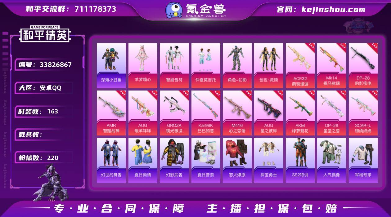 【蓝螳螂 4粉装12特效枪 可秒换绑不用等】 安卓Q区-66629热力值-163套装-220枪皮 【2稀有】 Mark.06 AWM-黄金龙骨【4粉装】 仲夏莫吉托 智能音符 创世·救赎 角色-羊梦糖心【12特效枪】 SCAR-L-锦绣绵绵(5级) DP-28-圣堂之誓(6级) M416-心之恋语(7级) AUG-星之彼岸(6级) AKM-绿萝繁花(5级) Mk14-福马献瑞(5级) ACE32-萌骑漫游(5级) AMR-智耀战神(6级) GROZA-镜光银凌(5级) Kar98K-巳巳如意(5级) DP-28-豹影疾电(4级) AUG-暖羊咩咩(4级)【34热门】 M416-蓝色火焰 GROZA-彩虹符号 长空猛禽 牛气冲天 妙红点点 懵萌河马 浪漫天命 破蛋小黄鸡 小丑鱼 深海小丑鱼 暗影哥特(红眼罩) 白色伏地魔 SS27特训 SS26特训 SS25特训 SS24特训 SS23特训 SS22特训 Mini14-梦幻火箭 Mark.06 AKM-缤纷海域 SCAR-L-玉兔迎春 GROZA-田园牧歌 M762-天降萌叽 Mk47-乌木金纹 UZI-娇憨猪猪 UMP45-蓝色火焰 DBS-彩虹符号 M249-彩虹符号 MG3-幻世战舞者 AKM-虎虎生威 AKM-星之彼岸【5飞行器】 星之彼岸飞行器 粉色滑翔尾迹 火焰蝠人飞行服 空岛之星尾迹 炫彩糖果飞行器 营地ID:928061182