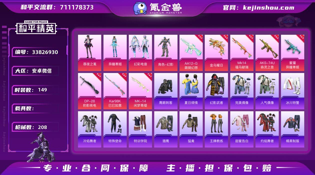 可二次【红眼罩 3粉装8特效枪】 安卓V区-54045热力值-149套装-208枪皮 【1稀有】 星河浪客【3粉装】 罪夜之冕 幻彩电音 角色-异瞳寒姬【8特效枪】 Mk14-闲梦青缨(7级) Mk14-福马献瑞(5级) 信号枪-金乌曜日(4级) AA12-G-萌骑幻想(4级) AKS-74U-森灵之息(4级) Kar98K-巳巳如意(5级) DP-28-豹影疾电(5级) 蜜獾-异瞳寒姬(5级)【20热门】 M416-蓝色火焰 长空猛禽 弄潮海豚 风暴特警 鹰眼刺客 破蛋小黄鸡 暗影哥特(红眼罩) 团圆交子 白色伏地魔 SS27特训 SS26特训 SS25特训 SS24特训 SS23特训 SCAR-L-玉兔迎春 M762-彩虹符号 DBS-彩虹符号 M249-彩虹符号 MG3-幻世战舞者【2飞行器】 炫彩糖果飞行器 英伦信使飞行器 营地ID:941097094