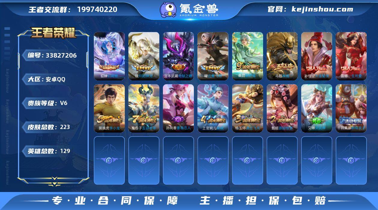 不可二次 安卓Q 1典藏4传说129英雄223皮肤 幻阙歌 鸣野蒿 炽阳神光 云鹰飞将 地狱之眼 神威 大圣娶亲 一生所爱 拒霜思 神迹守卫钟馗 冰冠公主 暗影游猎 原初追逐者 黎明之约 死神来了 梁祝 云间偶戏 电玩小子 无限星赏官 原初探秘者 李小龙 水晶猎龙者 猫狗日记男 猫狗日记女 金属风暴 地狱岩魂 特工魅影 特工战影 女武神 蔷薇恋人 黄金分割率 胡桃夹子 逐浪之夏 心灵战警 魅语 千年之狐 紫霞仙子 圣诞恋歌 幽灵船长 乘风破浪 圣诞狂欢 星夜王子 绅士熊喵 偶像歌手 街头霸王 箭羽风息 摇滚巨星 鬼剑武藏 冰雪圆舞曲 花好人间 御霄 御旌 御銮 朔风刀 混沌棋 疑决卦 醍醐杖 万华元夜 演武夺筹 驱傩正仪 千军破阵 拳王 沙漠行僧 金庭之子 霸王丸 大漠名商 云中旅人 丁香结 海盐诗旅 科学大爆炸 皇家上将 擒涛扼浪 魅力维加斯 探海日志 水果甜心 古海寻踪 天穹祈灯 无心 江河有灵 荣光圣徽 纤云弄巧 游园惊梦 五谷丰年 繁星吟游 遇见飞天 乱世虎臣 航海奇遇记 鹰眼统帅 魔术师 顽趣梦奇 王者荣耀账号