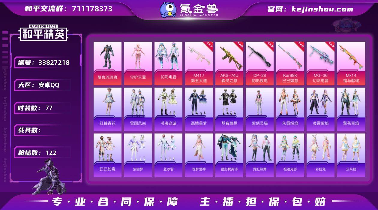 【kyhp465】安卓 手Q-3粉装-7特效枪-0载具-1粉色飞行器-32631热力值-5王牌印记-77套装-122枪皮 【粉色套装】:角色-复仇流浪者,角色-守护天翼,粉装-幻彩电音 【粉色枪皮等级】:AKS-74U-森灵之息(五级),Kar98K-巳巳如意(五级),M417-第五大道(七级),DP-28-豹影疾电(五级),MG-36-幻彩电音(五级) 【粉色枪皮】:AKS-74U-森灵之息,Kar98K-巳巳如意,Mk14-福马献瑞,M417-第五大道,DP-28-豹影疾电,MG-36-幻彩电音 【粉色飞行器】:炫彩糖果飞行器 【粉色降落伞】:绝对恒星降落伞,暗夜玫瑰降落伞,第五大道降落伞,鬼刀降落伞,星穹咏叹调降落伞,幻彩电音降落伞,冷漠罗丽降落伞,炫彩糖果降落伞,罪夜之冕降落伞 【稀有套装】:套装-巳巳如意,套装-雪国风尚,套装-炫彩糖果,套装-紫幽梦,套装-蓝冰羽,角色-瑰梦爱神,套装-星影赞美诗,套装-霓虹热舞,套装-极速光影,套装-彩虹兔,套装-云朵鹅,套装-雪绒豹,角色-乐音,套装-朱霞炽焰,套装-凌霄紫焰,套装-擎苍青焰,角色-紫俏灵猫,套装-书海巡游,套装-画境星梦,套装-琴音绮想,套装-雨过天青,套装-红釉青花 【稀有枪皮】:AUG-冰晶雪宝,AKM-破晓战魂,M16A4-蓝色火焰,SCAR-L-夜灯,SCAR-L-炫彩节奏,SCAR-...