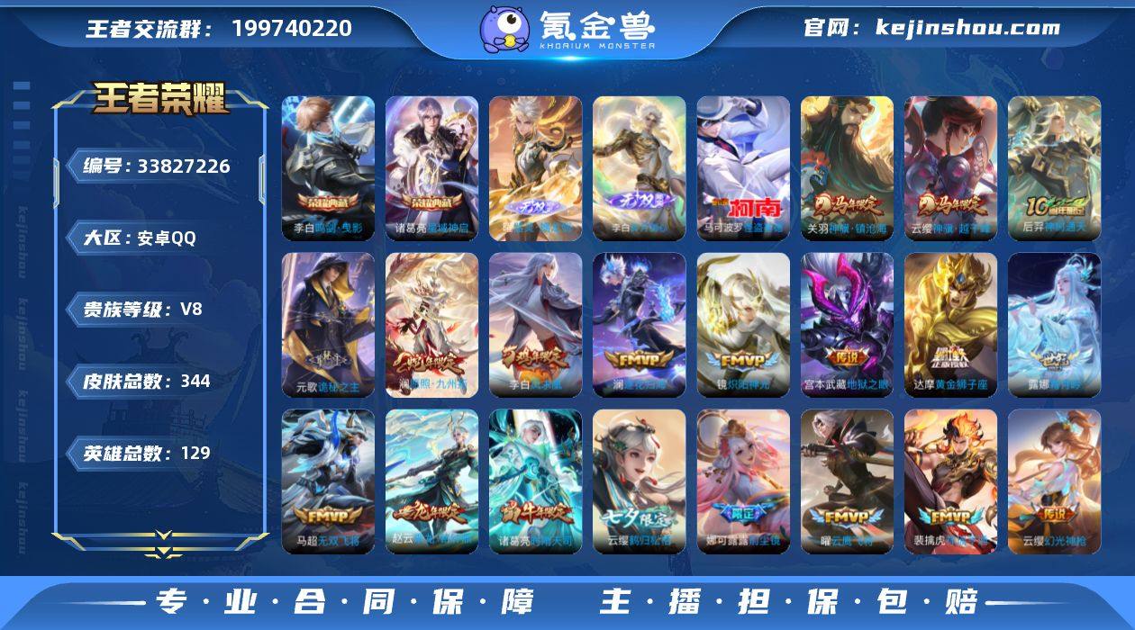 安卓Q-V8-至尊星耀III段位-129英雄-344皮肤-2典藏皮肤-2无双-1珍品传说-28传说-100史诗 【英雄全皮】:赵云全皮,元歌全皮,李白全皮,孙权全皮,娜可露露全皮,敖隐全皮,蒙恬全皮,戈娅全皮,影全皮 【荣耀典藏】:李白鸣剑曳影,诸葛亮星域神启 【无双皮肤】:曜器灵螭龙剑,李白碎月剑心 【珍品传说】:马可波罗怪盗基德 【传说皮肤】:云缨神骥越千峰,关羽神骥镇沧海,后羿神树通天,元歌诡秘之主,澜愿照九州拓,云缨幻光神枪,裴擒虎祥瑞亨通,桑启鸣野蒿,赵云乘龙铭钟鼎,澜逐花归海,露娜霜月吟,宫本武藏惊梅引,云缨鹤归松栖,李白诗剑行,娜可露露前尘镜,马超无双飞将,赵云淬星耀世,诸葛亮时雨天司,铠绛天战甲,镜炽阳神光,虞姬启明星使,曜云鹰飞将,达摩黄金狮子座,花木兰冠军飞将,后羿黄金射手座,李白凤求凰,宫本武藏地狱之眼,狄仁杰超时空战士 【限定皮肤】:白起狰,暃埋骨钱,蒙犽顽岩魄,姜子牙天穹之誓,李白谪仙醉月,狄仁杰阴阳师,赵云皇家上将,赵云引擎之心,赵云龙胆,赵云百木心枪,嬴政优雅恋人,元歌云间偶戏,元歌无心,夏侯惇朔风刀,曹操烛龙,典韦穷奇,马可波罗暗影游猎,狄仁杰魔术师,狄仁杰万华元夜,达摩星际陆战队,达摩...