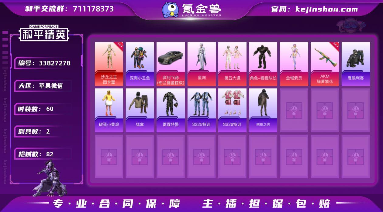 1红装 5粉装 5粉枪 2载具 60套装 82枪皮 13热门 宾利飞驰(布罗德盖棕双色) 沙丘之主-图卡盟 稀有紫装-暗夜之虎 猩猩队长 军械专家 电音精灵 潮流炫酷 冷焰舞者 贝斯之夜 惊鸿侠骨 竞技名士 锦衣飞扬 深蓝色名流 晨曦薄雾 酒红色名流 龙的传人 快闪甜心 春光漫游 湖蓝色名流 街舞之王 特战英豪 绮丽涂鸦 特殊使命 街舞达人 沙漠毒蛇 云虎纪 第五大道 极限特训 角色-金域紫灵 角色-星渊 S686-生命誓言 GROZA-影袭 Mini14-耀粉歌者 M416-红色方程式 MG3-镜域双华 AUG-耀粉歌者 M24-影袭 MG3-惊鸿侠骨 AC-VAL-快闪甜心 AMR-乌木金纹 M200-惊鸿侠骨 MK20-H-快闪甜心 爆炸猎弓-惊鸿侠骨 M417-惊鸿侠骨 UMP45-快乐主宰 P90-快闪甜心 M249-沙丘之主 M249-莲影清波 M249-星之彼岸 Vector-彩虹符号 P90-乌木金纹 AC-VAL-闲梦青缨 AKM-绿萝繁花(4级) 深海小丑鱼 SS26特训 SS25特训 AWM-雷霆特警 M762-天降萌叽 M249-彩虹符号 M16A4-快乐主宰 鹰眼刺客 M416-蓝色火焰 M762-快乐主宰 破蛋小黄鸡 长空猛禽 暗夜之虎 龙翔九天飞行器