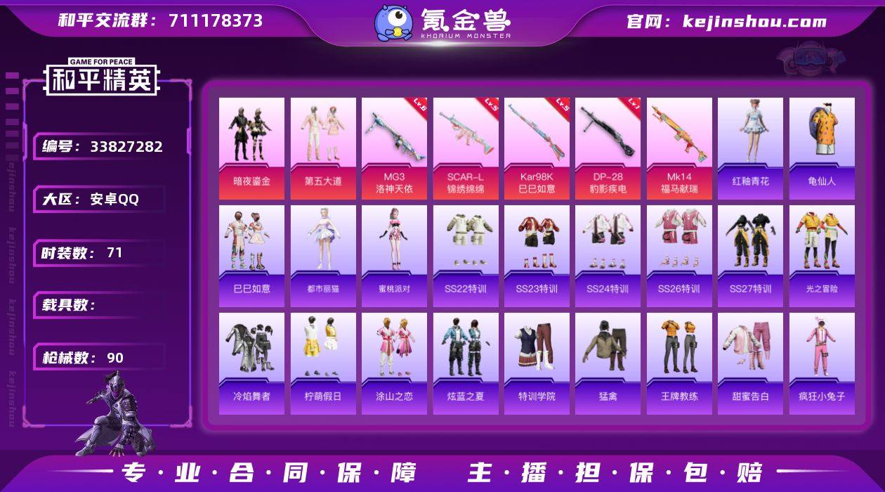 【kyhp473】安卓 手Q-3粉装-5特效枪-0载具-0粉色飞行器-27319热力值-2王牌印记-71套装-90枪皮 【热门品类】:套装-龟仙人 【粉色套装】:粉装-暗夜鎏金,粉装-第五大道 【粉色枪皮等级】:SCAR-L-锦绣绵绵(五级),Kar98K-巳巳如意(五级),DP-28-豹影疾电(一级),MG3-洛神天依(六级) 【粉色枪皮】:SCAR-L-锦绣绵绵,Kar98K-巳巳如意,Mk14-福马献瑞,DP-28-豹影疾电,MG3-洛神天依 【粉色降落伞】:恐龙拽拽降落伞,歌者泠鸢降落伞,暗夜鎏金降落伞,第五大道降落伞,圣堂之誓降落伞,精灵梦叶罗丽降落伞 【稀有套装】:套装-龟仙人,套装-巳巳如意,角色-都市丽猫,角色-蜜桃派对,套装-红釉青花 【稀有枪皮】:AKM-彩虹符号,M16A4-幻世战舞者,SCAR-L-炫彩节奏,SCAR-L-红色方程式,M416-糯团青竹,GROZA-懵萌河马,GROZA-田园牧歌,AUG-天降萌叽,AUG-海螺星光,M762-天降萌叽,M762-暗夜鎏金,Mk47-妙红点点,G36C-懵萌河马,AC-VAL-快闪甜心,蜜獾-天降萌叽,UZI-啾咪啾咪,UMP45-仲夏莫吉托,UMP45-涂山之恋,UMP45-蓝色火焰,Vector-焰鹰斗篷,Vector-彩虹符号,Vector-田园牧歌,汤姆逊-暗夜鎏金,汤姆逊-耀粉歌者,MP5K-飒粉甜心,P90-快闪甜心,Kar98K-彩虹符号,K...
