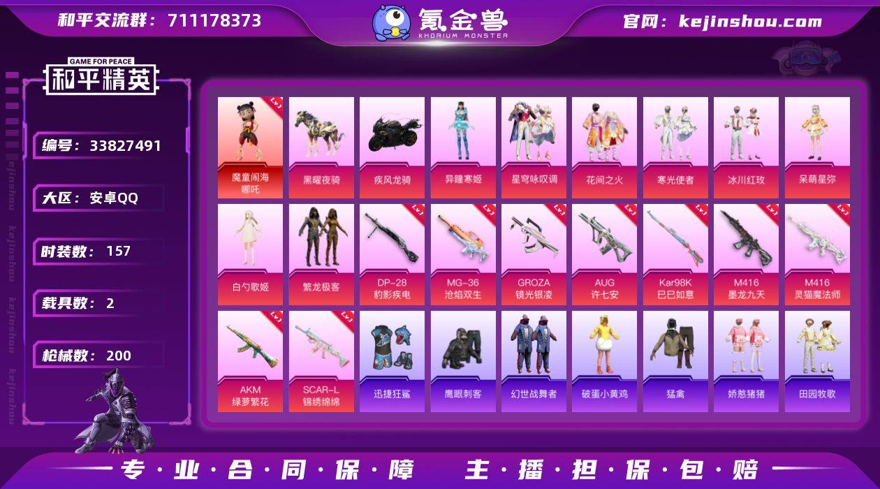 1红装 9粉装 9粉枪 2载具 157套装 200枪皮 26热门 疾风龙骑 黑曜夜骑 魔童闹海-哪吒 冷酷挑战者(稀有紫装) 稀有紫装-暗夜之虎 花间之火 冰川红玫 寒光使者 甜蜜菠萝 超能勇士 繁龙极客 幻羽潜行 虎虎生威吉莉 炫蓝之夏 黄色名流 牛气满满 破晓战魂 鹤鸣 荣耀 隐空刺 福星高照 幻彩翩翩 柠萌假日 王牌教练 青玉碎影 龟仙人 无暇誓言 冷焰舞者 空岛之星 贝斯之夜 都市漫游者 惊鸿侠骨 萌趣咩咩 竞技名士 娇憨猪猪 锦衣飞扬 深蓝色名流 灵幻魔术师 灵动马戏师 绝对偶像 酸甜橘柚 酒红色名流 龙的传人 玉兔迎春 快闪甜心 摇滚舞王 春光漫游 战地菁英 轻风白浪 湖蓝色名流 雨林探路者 绯格组合 野性山猫 青春校园 怒火燎原 绮丽涂鸦 耀眼新星 缤纷果语 野性战心 Alan Walker 暗金炫舞 格斗先锋 幻世战舞者 幻影武者 夏日音浪 辉星之火 白勺歌姬 呆萌星弥 极限特训 角色-异瞳寒姬 星穹咏叹调 M416-墨龙九天(3级) M416-灵猫魔法师(3级) SCAR-L-锦绣绵绵(5级) AKM-绿萝繁花(5级) AUG-许七安(7级) Kar98K-巳巳如意(5级) GROZA-镜光银凌(5级) DP-28-豹影疾电(5级) MG-36-沧焰双生(5级) 迅捷狂鲨 冰川格斗者 SS27特训 SS26特训 SS25特训 SS24特训 SS23特训 SS22特训 AWM-雷霆特警 SCAR...