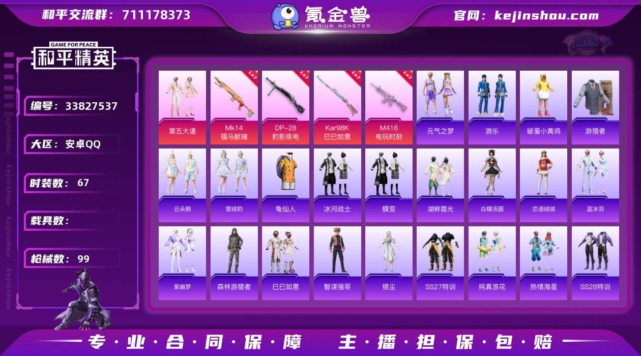 M1047885安卓手Q-1粉装-4特效枪-67套装-99枪皮-2王牌印记-英勇黄金Ⅰ-27707热力值【1粉装】第五大道【4特效枪】Kar98K-巳巳如意[5级],M416-电玩时刻[5级],Mk14-福马献瑞[5级],DP-28-豹影疾电[5级]【1稀有】S686-奇异狩猎者【5飞行器】破刃行动尾迹,鸡智如我飞行器,空岛之星尾迹,炫彩糖果飞行器,马上有福飞行器【160其它衣服和枪皮】朱霞炽焰,蓝色运动,白熊同盟,狙击之神,恋语绒绒,极速光影,战术大师,冰河战士,SS27特训,长空猛禽,蓝冰羽,擎苍青焰,蓝调潮人,红色运动,空岛之星,海盐绵绵冰,SS33特训,炫彩糖果,摇滚战魂,云朵鹅,湖畔霞光,幻羽潜行,王牌教练,马上有钱,游乐,SS32特训,元气之梦,巳巳如意,龙魂突击队,SS28特训,智谋强哥,焰鹰斗篷,街头潮人,超能勇士,燃烧卡路里,热情海星,SS37特训,薄荷星砂,云魄琉璃,海岛探路者,幽夜迷踪,老实芭蕉,蝶变,纯真浪花,SS34特训,SS35特训,萌鸡速递,战地督导,魅力单车,龟仙人,雪绒豹,青玉碎影,SS31特训,凌霄紫焰,漫游都市,SS36特训,森林游猎者,春日漫步,紫幽梦,缤纷果语,破蛋小黄鸡,白糯汤圆,顽皮玉兔,角色-曹焱兵,角色-银尘,柠萌假日,AKM-破晓战魂,MG-36-凌霄紫焰,汤姆逊-幻影战神,P90-巳巳如意,JS9-凌霄紫焰,GROZA-紫矿核心,S686-千金淑猫,短...