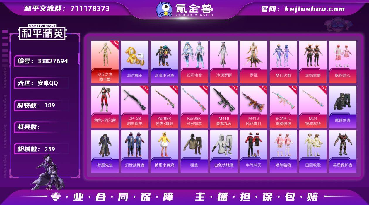 1红装 8粉装 9粉枪 2稀有装备 189套装 259枪皮 45热门 派对舞王(金靴子) 沙丘之主-图卡盟 冷酷挑战者(稀有紫装) 梦幻火箭 稀有紫装-派对舞王(金靴子) 阿尔茜 幻羽潜行 虎虎生威吉莉 疯狂小兔子 艾克斯奥特曼 萌黄之夏 黄色名流 牛气满满 猛禽 甜蜜告白 破晓战魂 鹤鸣 天籁歌者 耀粉歌者 熠彩粉晶 摩登艾咪 莱茵河畔 福星高照 神气柴柴 银河圣歌 幻彩翩翩 柠萌假日 王牌教练 龟仙人 果汁能量 涂山之恋 空岛之星 香榭午后 都市漫游者 惊鸿侠骨 萌趣咩咩 竞技名士 清新柠檬 娇憨猪猪 锦衣飞扬 深蓝色名流 元气发射 晨曦薄雾 绝对偶像 酒红色名流 战地督导 灼焰舞者 龙的传人 玉兔迎春 快闪甜心 森林游猎者 田园牧歌 春光漫游 轻风白浪 湖蓝色名流 蓝色守护者 雨林探路者 绯格组合 冰冻风暴 街头潮人 怒火燎原 蓝彩潮人 绮丽涂鸦 耀眼新星 旭日情侣 缤纷果语 野性战心 沙漠毒蛇 幻世战舞者 麻辣教官 幻影武者 都市魅力 冰川特警 沙漠兵团 赤焰黑爵 飒粉甜心 角色-冷漠罗丽 角色-罗征 幻彩电音 M416-墨龙九天(3级) M24-镜域双华(3级) M416-风花雪月(7级) S686-生命誓言 汤姆逊-奇异狩猎者 GROZA-影袭 G36C-镜域双华 S1897-炫彩节奏 Mini14-耀粉歌者 汤姆逊-炫彩节奏 Kar98K-...