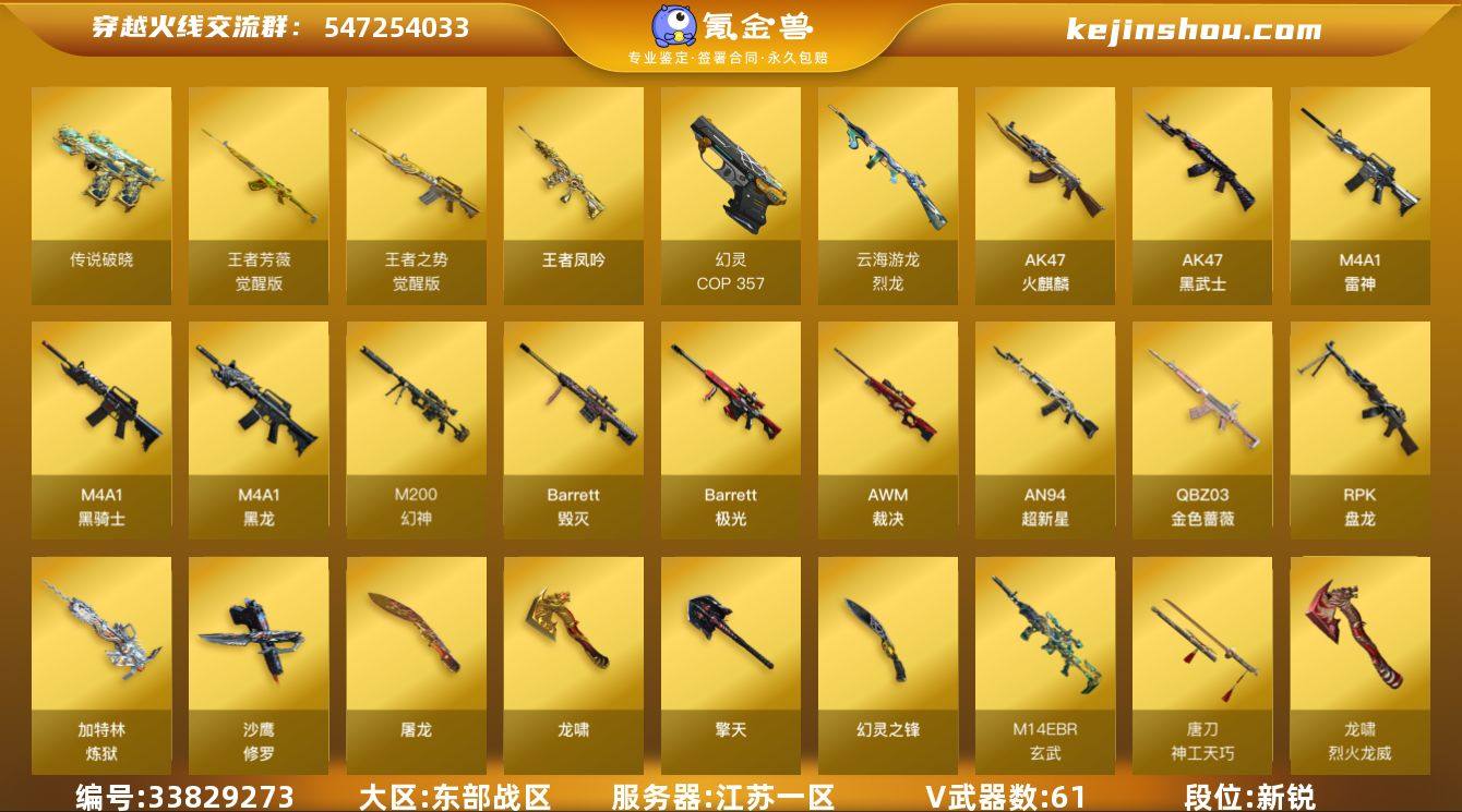 【ky7153】江苏一区-71V-3王者武器数-0炫金武器数 【传说武器】:传说破晓 【传说角色】:传说艾莉莎 【热门武器】:传说破晓,QBZ03-金色蔷薇,M14EBR-玄武,M200-幻神,C.A.T,牛牛-AK47,M4A1-黑骑士,RPK-盘龙,加特林-炼狱*2,COP 357-幻灵,沙鹰-修罗*2,柯尔特-赛博朋克,Knife-冠军之刃*2,金刚伞 【王者炫金武器】:王者凤吟 【音效卡】:屠龙-动感闪耀 音效卡,烈火-动感闪耀 音效卡,屠龙-电竞之星-竞星跃动音效卡,AK47-火麒麟音效卡,M4A1-黑骑士音效卡,Barrett-毁灭音效卡,Barrett-极光音效卡,QBZ03-金色蔷薇音效卡,HK417-朱雀-电竞之星-竞星跃动音效卡,天罚-斗烈龙驹-斗烈音效卡,屠龙-斗烈龙驹-斗烈音效卡 【皮肤】:幻神-周瑜皮肤,幻神-冠军之幻,M200-幻神-荣耀世冠白鲨,幻神-电竞之星 皮肤,裁决-运输船 皮肤,裁决-胜者为王 皮肤,裁决-星际旅行 皮肤,白虎-大汉风骨,金色蔷薇-枪娘阿敏 皮肤,QBZ03-荣耀世冠白鲨,QBZ03-巅峰荣耀皮肤,雷神-暗月,雷神-荣耀世冠AG,雷神-宇航兔皮肤,雷神-维纳斯皮肤,火麒麟-华夏之心,传奇石头-横秒之巅,火麒麟-百城,火麒麟-巅峰荣耀,火麒麟-心动糖果,毁灭-冠军之怒,毁灭-黑曼巴 皮肤,毁灭-英雄计划 皮...