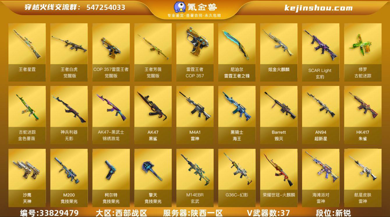 陕西一区-44V-11王者武器数-1炫金武器数 【传说角色】:传说影煞 【热门武器】:G36C-幻影,M14EBR-玄武,HK417-朱雀,金色蔷薇-古蛇迷踪,修罗-古蛇迷踪,M200-竞技荣光,荣耀世冠-火麒麟,羊驼玩偶,COP 357-雷霆王者 【王者炫金武器】:王者星霆,COP 357-雷霆王者,雷霆王者之锋,高爆手雷-雷霆王者*3,炫金火麒麟 【音效卡】:HK417-朱雀音效卡,M4A1-黑骑士音效卡,Barrett-毁灭音效卡,天罚-斗烈龙驹-斗烈音效卡,屠龙-斗烈龙驹-斗烈音效卡 【皮肤】:雷神-航星皮肤,雷神-海滩派对 皮肤,雷神-源计划2.0专属 皮肤,雷神-神秘按键 皮肤,毁灭-英雄计划 皮肤 【角色】:雨棠,晴雅,王者潘多拉,蛇隐宗,斗烈龙骑,暗夜-X,飞虎队-X,风暴女,兰-新年限定,零-水下丽影,龙儿,曼陀罗-X,蛇姬,影武者-X 【挑战大师】:冰龙粉碎者-白马银枪 【英雄级武器】:M4A1-雷神,AN94-超新星,AK47-黑鲨,HK417-朱雀,M14EBR-玄武,无影-神兵利器*2,黑武士-锦绣游龙,G36C-幻影,金色蔷薇-古蛇迷踪,SCAR Light-玄豹,黑骑士-海王,王者白虎-觉醒版,王者芳薇-觉醒版,荣耀世冠-火麒麟,天罚-斗烈龙驹,Barrett-毁灭,M200-竞技荣光,沙鹰-天神*2,COP 357-雷霆王者-觉醒版,柯...