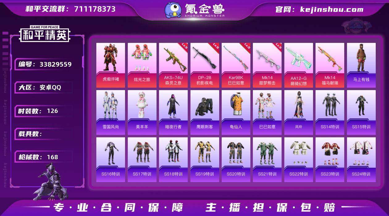 安卓 手Q-2粉装-6特效枪-0载具-1粉色飞行器-48283热力值-1王牌印记-126套装-168枪皮 【热门品类】:套装-暗夜行者,套装-龟仙人 【粉色套装】:粉装-炫光之旅,角色-虎痴许褚 【粉色枪皮等级】:AKS-74U-森灵之息(五级),Kar98K-巳巳如意(五级),Mk14-甜梦熊击(五级),DP-28-豹影疾电(五级) 【粉色枪皮】:AKS-74U-森灵之息,Kar98K-巳巳如意,Mk14-甜梦熊击,Mk14-福马献瑞,AA12-G-萌骑幻想,DP-28-豹影疾电 【粉色飞行器】:炫彩糖果飞行器 【粉色降落伞】:暗夜鎏金降落伞,天星战神降落伞,江南烟雨降落伞,精灵梦叶罗丽降落伞,临安公主降落伞,幻彩电音降落伞,炫彩糖果降落伞,虎痴许褚降落伞 【稀有套装】:套装-龟仙人,套装-巳巳如意,套装-雪国风尚,套装-马上有钱,角色-风玲,玩偶服-美羊羊 【稀有枪皮】:AKM-彩虹符号,AKM-影袭,AKM-春暖花开,AKM-生命誓言,AKM-破晓战魂,AKM-萌趣颜团子,AKM-虎虎生威,AKM-霓虹街区,AKM-龙的传人,M16A4-幻世战舞者,M16A4-红色方程式,M16A4-蓝色火焰,SCAR-L-玉兔迎春,SCAR-L-红色方程式,M416-夜灯,M416-红色方程式,M416-蓝色火焰,GROZA-异彩先驱,GROZA-彩虹符号,GROZA-影袭,GROZA-恐龙拽拽,GROZA-田园牧歌...