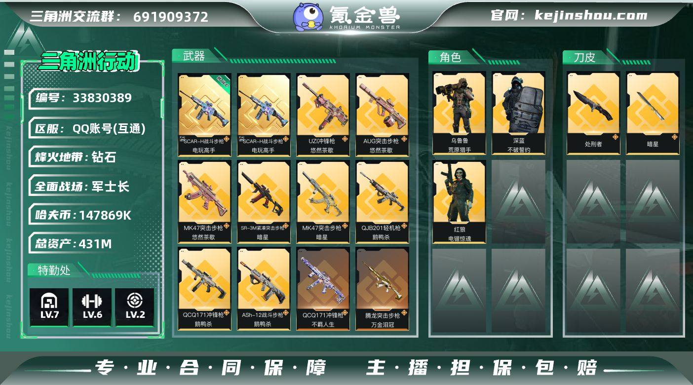 QQD272/可二次/QQ区【431M高资产+147M纯币】【总资产:431M+近战暗星+SCAR-H战斗步枪-电玩高手+S8赛季通行证】/烽火等级:60/全面战场:28/纯币:147M/三角券加币:476(35三角币+441三角券)【近战-暗星】【乌鲁鲁-荒原猎手】【红狼-电锯惊魂】【深蓝-不破誓约】//部门:12211/特勤等级(技术中心3级/工作台3级/制药台2级/防具台3级/仓库7级/指挥中心3级/训练中心6级/靶场2级/潜水中心级0/收藏室1级)---暗星捆绑包---/橙色挂饰x5/流动资产:410M段位:钻石V/详细看图