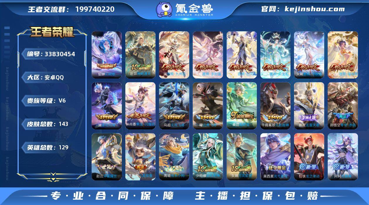 安卓Q-V6-永恒钻石I段位-129英雄-143皮肤-1典藏皮肤-17传说-37史诗QW2642208 【荣耀典藏】:貂蝉幻阙歌 【传说皮肤】:后羿神树通天,司空震愿照山河定,女娲愿照千秋盛,妲己愿照众生和,澜愿照九州拓,蔡文姬愿照福禄聚,虞姬愿照岁时盈,嬴政玄雷天君,桑启鸣野蒿,孙尚香乘龙问璇玑,澜逐花归海,马超无双飞将,赵云淬星耀世,李元芳飞鸢探春,孙悟空零号赤焰,曜云鹰飞将,干将莫邪久胜战神 【限定皮肤】:狄仁杰阴阳师,赵云皇家上将,庄周高山流水,元歌无心,狄仁杰魔术师,项羽海滩派对,兰陵王金庭之子,孙悟空零号赤焰,李元芳云中旅人,沈梦溪大漠名商,裴擒虎擒涛扼浪,云中君纤云弄巧,嫦娥拒霜思,鲁班大师探海日志,艾琳女武神,张良古海寻踪,蒙犽百解令,高渐离燃音魔法,妲己灵卜魔法,鬼谷子天穹祈灯,大乔乘龙忆丹青,安琪拉乘龙聚宝船,孙尚香乘龙问璇玑,李元芳蔬乡物语 【年限皮肤】:孙尚香乘龙问璇玑,大乔乘龙忆丹青,安琪拉乘龙聚宝船,司空震愿照山河定,女娲愿照千秋盛,妲己愿照众生和,澜愿照九州拓,蔡文姬愿照福禄聚,虞姬愿照岁时盈 【赛季限定】:兰陵王金庭之子,沈梦溪大漠名商,李元芳云中旅人,裴擒虎擒涛扼浪,鲁班大师探海日志,张...