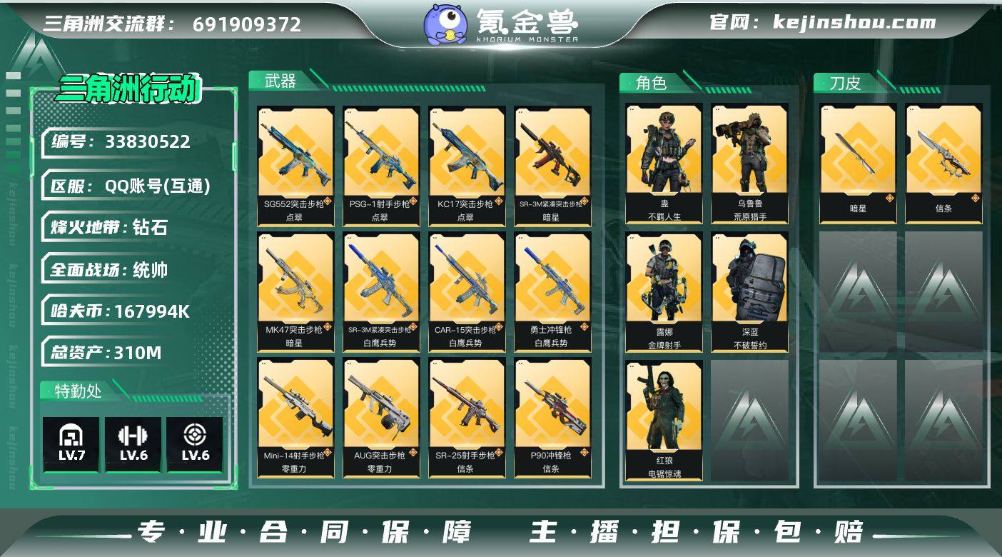 QQD285/可二次/QQ区【总资产:310M+近战暗星+近战信条+60发AWM子弹+S8赛季通行证】/烽火等级:60/全面战场:50/纯币:167M/三角券加币:568(0三角币+568三角券)【近战-暗星】【近战-信条】【红狼-电锯惊魂】【蛊-不羁人生】【乌鲁鲁-荒原猎手】【深蓝-不破誓约】【露娜-金牌射手】//部门:22322/特勤等级(技术中心3级/工作台3级/制药台3级/防具台3级/仓库7级/指挥中心5级/训练中心6级/靶场6级/潜水中心2级/收藏室1级)---暗星捆绑包/信条捆绑包---/橙色挂饰x8/流动资产:277M段位:钻石II/详细看图
