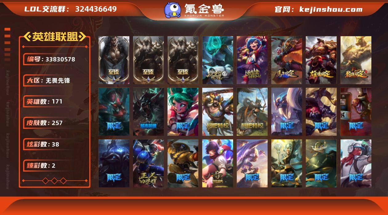 【皇冠号】未定级段位-171英雄-257皮肤-38炫彩-0终极-5神话-36限定-36传说-56史诗 【神话皮肤】:十周年纪念安妮,源代码乐芙兰,至臻腥红之月亚托克斯,至臻腥红之月亚托克斯2022 【热门头像】:觅心游侠卢锡安头像 【至臻皮肤】:至臻狼神英灵斯维因,至臻腥红之月亚托克斯,至臻腥红之月亚托克斯(2022) 【臻彩皮肤】:魔女阿卡丽虚荣,净雪之月莫甘娜冬虹 【年限皮肤】:替父从军花木兰,张辽文远,北辰之威内瑟斯 【冰雪限定】:圣诞开心鬼提莫,阿木木“主人不要我了”,胡桃夹子萨科,雪默丁格,圣诞玩偶波比,圣诞驯鹿克格莫,圣诞老人布隆,冰雪节辛吉德,冰雪节玛尔扎哈 【限定皮肤】:卧虎藏龙贾克斯,冠军之隐劫,Fnatic迦娜,Fnatic库奇,SSW辛吉德,SKTT1奥拉夫,iG菲奥娜,FPX薇恩,电玩女神阿狸,暗裔英雄盖伦,胜利凤凰艾尼维亚,大魔王提莫,鬼影重重魔腾,无头骑士赫卡里姆,破空枪骑孙悟空,暗影沃里克,野兽猎人瑟庄妮,野兽猎人泰达米尔,波比的巧克力工坊,勇者阿狸,都铎王朝图奇,征服者诺提勒斯,防暴士兵辛吉德,防暴天使凯尔 【传说皮肤】:大天使长米迦勒凯尔,战场女武神凯尔,钢铁之翼凯尔,源计划林易,欧米伽小队幽灵特工,烈焰雄心崔丝塔娜,...