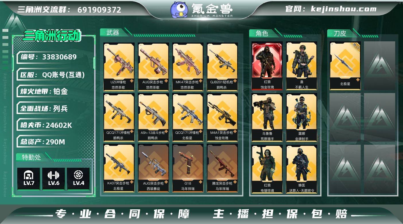 QQD302/包人脸/QQ区【总资产:291M+近战北极星+红狼蚀金玫瑰+S9赛季通行证+非洲之心+40发AWM子弹】/烽火等级:60/全面战场:23/纯币:24602K/三角券加币:459(19三角币+440三角券)【近战-北极星】【红狼-蚀金玫瑰】【红狼-电锯惊魂】【蜂医-无题密令】【蛊-不羁人生】【乌鲁鲁-荒原猎手】【露娜-金牌射手】//部门:22212/特勤等级(技术中心3级/工作台3级/制药台3级/防具台3级/仓库7级/指挥中心5级/训练中心6级/靶场4级/潜水中心1级/收藏室1级)---北极星捆绑包---/橙色挂饰x5/流动资产:270M段位:铂金I/详细看图 【热门藏品】:藏品-非洲之心
