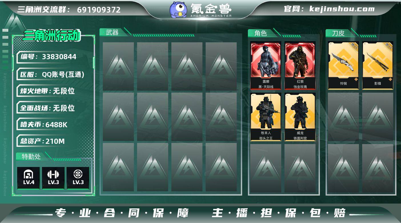 LJ4313总资产209.7M哈弗币6488K近战武器-怜悯,近战武器-影锋红狼蚀金玫瑰,威龙铁面判官,露娜黑天际线,牧羊人街头之王无无AW子弹3发三角币58仓库LV.9基础安全箱靶场LV.7训练中心LV.7无,红狼-蚀金玫瑰,威龙-铁面判官,露娜-黑·天际线,牧羊人-街头之王,近战-怜悯,近战-影锋