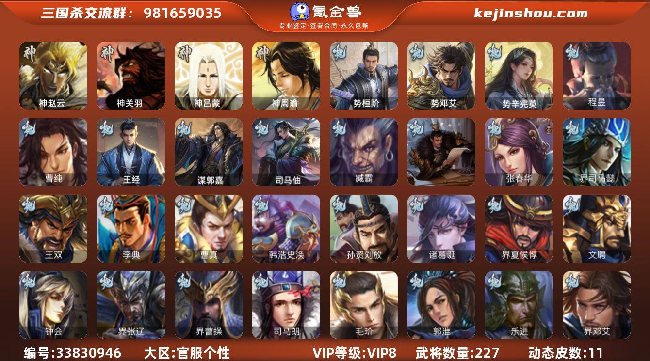 【14790387】官阶:领军将军;VIP等级:VIP8;史诗武将数量:9;动态皮肤数量:11;武将总数:227;史诗宝珠数量:12;将魂数量:5853;神将:1;魏国史诗武将:6;蜀国史诗武将:2;吴国史诗武将:1;群史诗武将:0