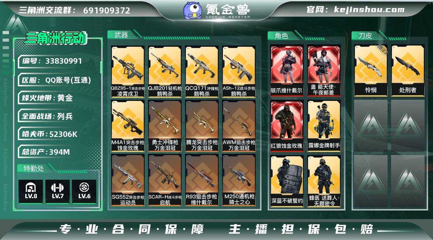 【931484】红狼 女医 小麦红皮 带怜悯 烽火地带段位: 黄金 全面战场段位: 列兵 总资产: 394000000 哈夫币: 52306000 sjs8943 干员外观: 红狼-蚀金玫瑰,蜂医-送葬人·无题密令(S5),蛊-能天使·午夜邮差,深蓝-不破誓约(S6),骇爪-维什戴尔,露娜-金牌射手(S7) 传说武器皮肤: M4A1突击步枪-蚀金玫瑰,近战-怜悯,725双管霰弹枪-送葬人-无题密令,M4A1突击步枪-阿米娅,CAR-15突击步枪-阿米娅,AWM狙击步枪-捞点薯条,腾龙突击步枪-捞点薯条,93R-捞点薯条,AK-12突击步枪-特斯拉线圈,SR-3M紧凑突击步枪-特斯拉线圈,UZI冲锋枪-特斯拉线圈,勇士冲锋枪-能天使-午夜邮差,Vector冲锋枪-能天使-午夜邮差,M250通用机枪-骑士之心,R93狙击步枪-维什戴尔,SCAR-H战斗步枪-启航,ASh-12战斗步枪-鹅鸭杀,QCQ171冲锋枪-鹅鸭杀,QJB201轻机枪-鹅鸭杀,SG552突击步枪-运动员,近战-处刑者,M14射手步枪-蛮荒,QBZ95-1突击步枪-凌霄戍卫,勇士冲锋枪-万金泪冠,腾龙突击步枪-万金泪冠,AWM狙击步枪-万金泪冠 史诗武器皮肤: M700狙击步枪-竞技风,SVD狙击步枪-阿萨拉工艺,QBZ95-1突击步枪-曙光,S12K霰弹枪-曙光,M700狙击步枪-蝮蛇,勇士冲锋枪-深海恐惧,MP5冲锋枪-深海恐惧,SV-98狙击步枪-林中猎手,M250通用机枪-囚徒,SV-98...