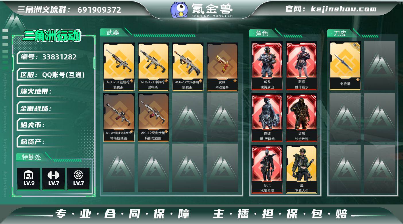 实名: 不可修改 干员外观: 红狼-蚀金玫瑰,骇爪-水墨云图,蜂医-送葬人·无题密令(S5),露娜-黑·天际线,深蓝-不破誓约(S6),骇爪-维什戴尔,威龙-凌霄戍卫,蛊-不羁人生 传说武器皮肤: 近战-北极星,93R-捞点薯条,AK-12突击步枪-特斯拉线圈,SR-3M紧凑突击步枪-特斯拉线圈,ASh-12战斗步枪-鹅鸭杀,QCQ171冲锋枪-鹅鸭杀,QJB201轻机枪-鹅鸭杀 亮点: hf16648总资产214m+黑天际线全套+午夜邮差全套+凌霄戍卫全套+蚀金玫瑰全套+维什戴尔全套+水墨云图全套+北极星全套+死神玫瑰全套+鹅鸭杀全套+捞点薯条全套+特斯拉线圈全套+s5s6赛季通行证+烽火等级60+特勤部门等级可以+永久包赔