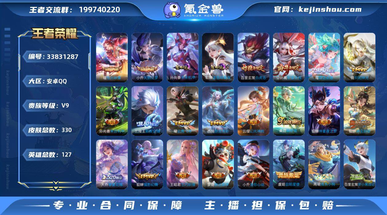 实名: 可修改 贵族等级: V9 英雄数: 127 皮肤数: 330 荣耀水晶: 天鹅之梦,拾光映像 星传说: 未来机甲,金色仲夏夜 传说皮: 云鹰飞将,猫影幻舞,炽阳神光,末日机甲-孙尚香,仲夏夜之梦,音你心动-小乔,胖达荣荣,乞巧织情,游龙清影,遇见胡旋,挚爱花嫁,幻光神枪 限定皮: 李小龙,奔雷神使,祈雪灵祝,游园惊梦,云端筑梦师,白鹤梁神女,白晶晶,天狼溯光者,神威,蜜橘之夏,时之彼端,奇迹圣诞,天狼运算者,逐梦之光,白虎志,凤凰于飞,如梦令-嫦娥,纯白花嫁,默契交锋-兰陵王,一生所爱,默契交锋-花木兰,霸王别姬-虞姬,高山流水,女儿国国王,傲雪梅枪,寅虎·心曲,寅虎·展翼,时之祈愿-瑶,五谷丰年,山海·玄木吟,山海·碧波行,至美·乘鲤谣,鸣野蒿,逐霄战戟