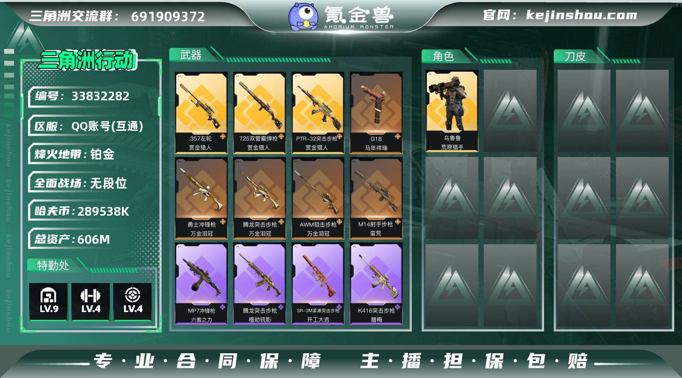 【PTSJZ4940】总资产606M/哈夫币28953万/传说枪皮数8/战场等级1/行动等级60/安全箱等时效性道具以游戏内数据为准,详情请看图/乌鲁鲁-荒原猎手/近战-黑鹰/PTR-32突击步枪-赏金猎人/腾龙突击步枪-万金泪冠/勇士冲锋枪-万金泪冠/725双管霰弹枪-赏金猎人/M14射手步枪-蛮荒/AWM狙击步枪-万金泪冠/.357左轮-赏金猎人/G18-马年祥瑞/腾龙突击步枪-檀劫铳影/K416突击步枪-冬日风情/K416突击步枪-腊梅/K437突击步枪-丛林谍踪/SR-3M紧凑突击步枪-开工大吉/勇士冲锋枪-丛林谍踪/MP7冲锋枪-六套之力/M249轻机枪-丛林谍踪/QJB201轻机枪-炽焰/VSS射手步枪-丛林谍踪/QBZ95-1突击步枪-海岸线/SG552突击步枪-2026/SG552突击步枪-马年新春/SG552突击步枪-贴花艺术/ AK-12突击步枪-马年新春/CAR-15突击步枪-来财/K437突击步枪-生存指令/KC17突击步枪-来财/MK47突击步枪-精英联盟/SMG-45冲锋枪-行动开启/SR-3M紧凑突击步枪-马年新春/MP7冲锋枪-前沿科技/Mini-14射手步枪-荣耀列队/Mini-14射手步枪-来财/M7战斗步枪-噬菌体/G17-斑马/SKS射手步枪-彩墨涂鸦/QBZ95-1突击步枪-三角洲力量/QBZ95-1突击步枪-2026/K416突击步枪-重击/M7战斗步枪-重击/M7战斗步枪-黑巧甜心/SG552突击步枪-浅蓝涂装/SCAR-H战...