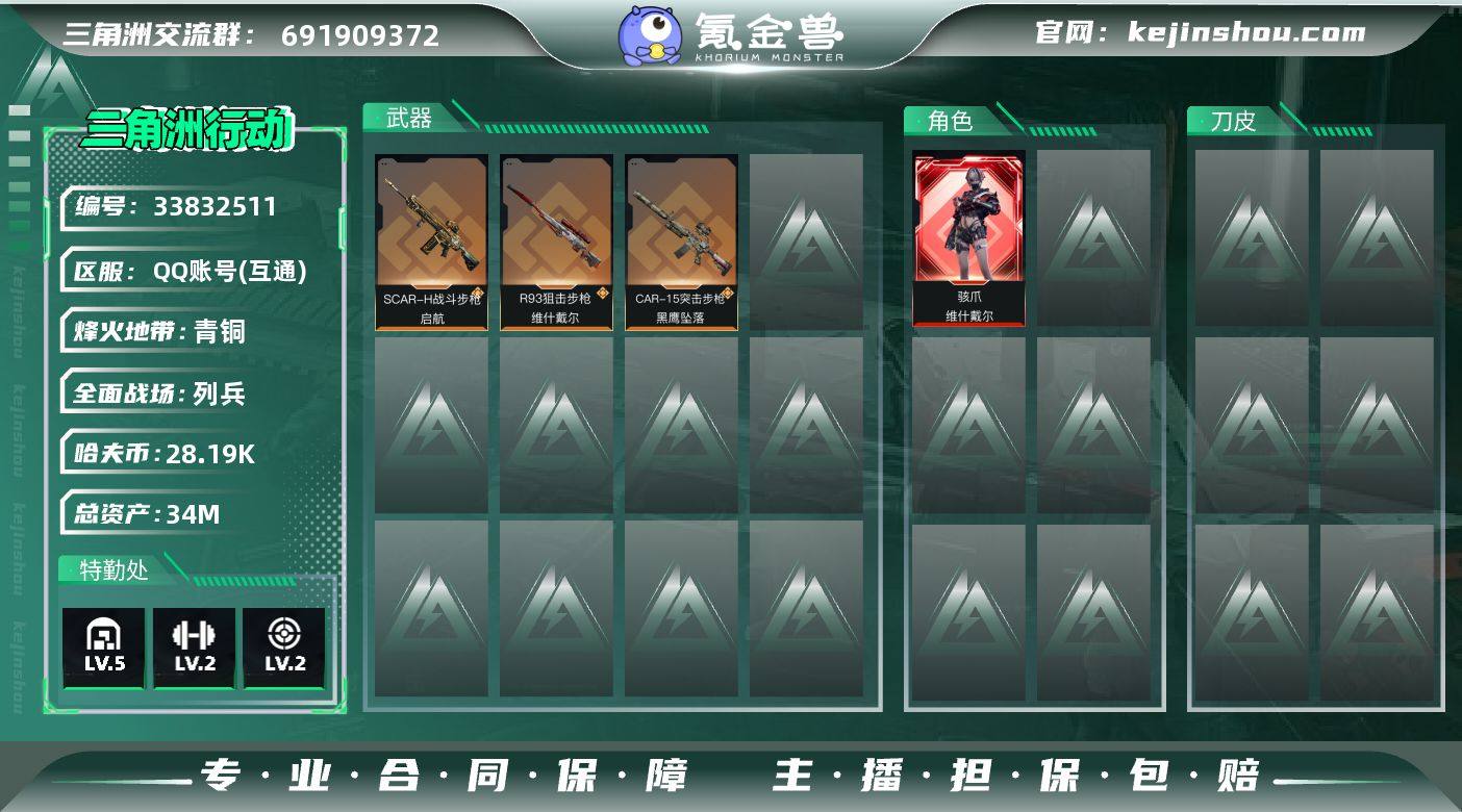 WLSJZ1003【红皮骇爪-维什戴尔】三端互通-总价值34M-哈夫币28190k-烽火地带等级29-烽火地带【干员皮肤】骇爪-维什戴尔【近战武器】黑鹰【枪皮】M4A1突击步枪-零点 QBZ95-1突击步枪-海色 QBZ95-1突击步枪-2026 K416突击步枪-高雅黑 K416突击步枪-碳纤维 K416突击步枪-银影杀手 M16A4突击步枪-高雅黑 M7战斗步枪-捣蛋鬼 AK-12突击步枪-零点 SCAR-H战斗步枪-数码迷彩 SCAR-H战斗步枪-荣耀列队 SCAR-H战斗步枪-囚徒 SCAR-H战斗步枪-启航 K437突击步枪-生存指令 MP5冲锋枪-海色 MP5冲锋枪-哈夫克卫队 MP5冲锋枪-战术竞备 P90冲锋枪-捣蛋鬼 SMG-45冲锋枪-行动开启 勇士冲锋枪-冰天雪地 PKM通用机枪-变色龙 M250通用机枪-条纹 QJB201轻机枪-哈夫克卫队 SVD狙击步枪-战术行动 R93狙击步枪-维什戴尔 沙漠之鹰-海浪 沙漠之鹰-高雅黑【载具】M1A4坦克-护林人 突击车-寒梅 轮式突击炮-荣耀 侦察直升机-烟火2026 侦察直升机-酒红 突击直升机-原始伪装【挂饰】维什戴尔 启程