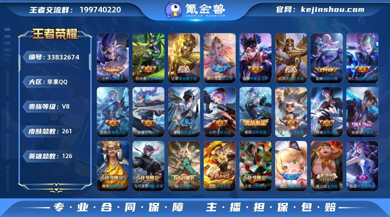 实名: 可修改 性别: 男号 贵族等级: V8 英雄数: 126 皮肤数: 261 荣耀水晶: 天鹅之梦 传说皮: 黄金狮子座,黄金射手座,猫影幻舞,云霓雀翎,末日机甲-孙尚香,仲夏夜之梦,音你心动-小乔,海洋之心,飞鸢探春,音你心动-周瑜,超时空战士-狄仁杰,碎云,天秀幻梦 限定皮: 遇见飞天,李小龙,梁祝,辉光之辰,至尊宝,高山流水,猪悟能,前尘镜,时之奇旅-妲己 亮点: 【优质装备】:天鹅之梦(小乔典藏),黄金狮子座,黄金射手座,猫影幻舞,云霓雀翎,末日机甲-孙尚香(绿蚂蚱),仲夏夜之梦(大飞蛾),音你心动-小乔,海洋之心,飞鸢探春,音你心动-周瑜,超时空战士-狄仁杰,碎云,天秀幻梦