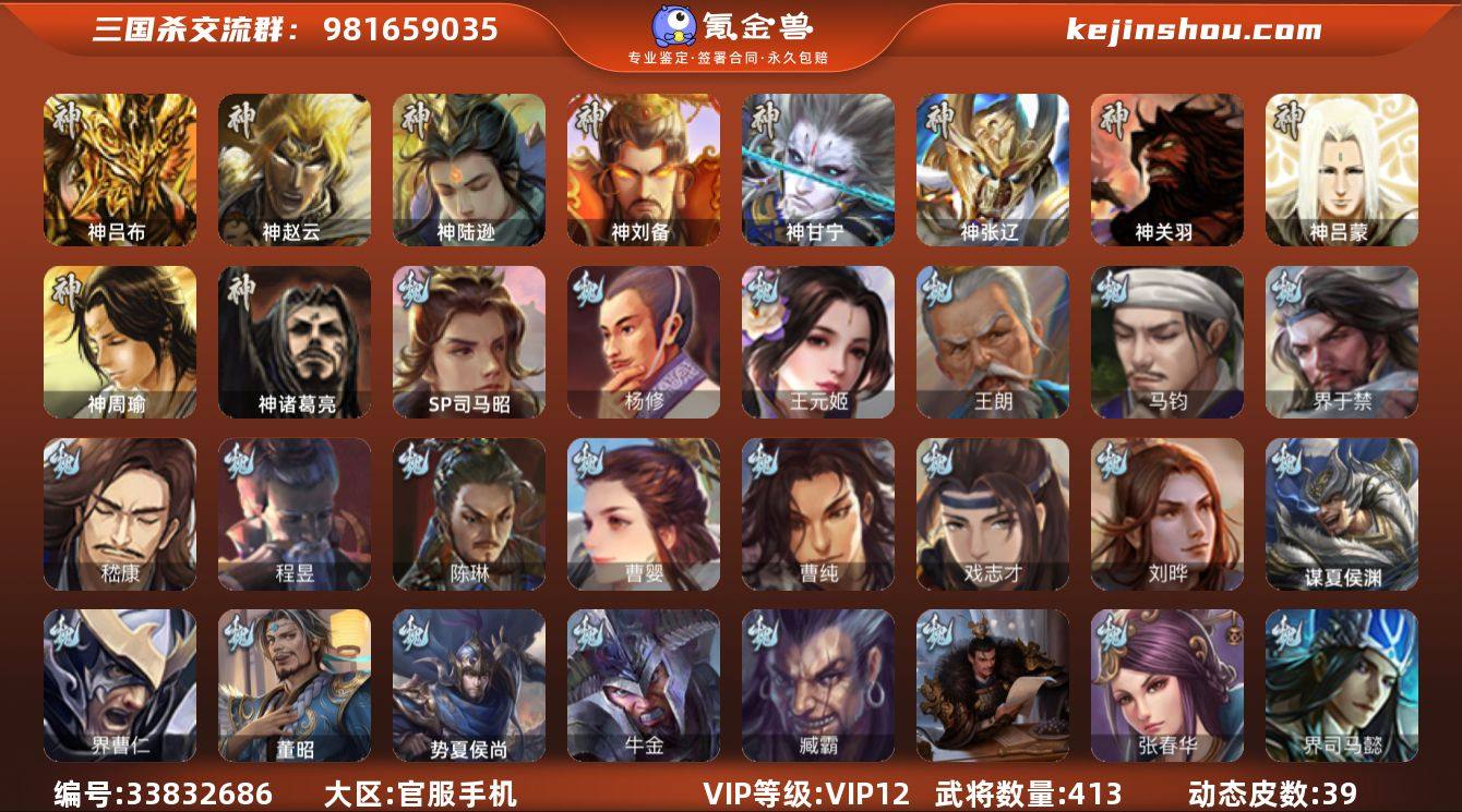 【14790391】官阶:大将军;VIP等级:VIP12;史诗武将数量:55;动态皮肤数量:39;武将总数:413;史诗宝珠数量:0;将魂数量:349;神将:7;魏国史诗武将:20;蜀国史诗武将:12;吴国史诗武将:6;群史诗武将:18