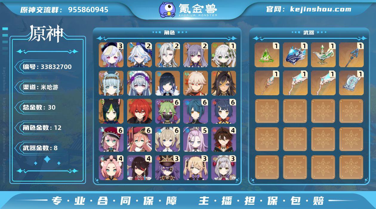 原神官服59级账号角色22金二命专武龙王,二命芙芙,一名专武草神,武器8金,练度高,邮箱没绑