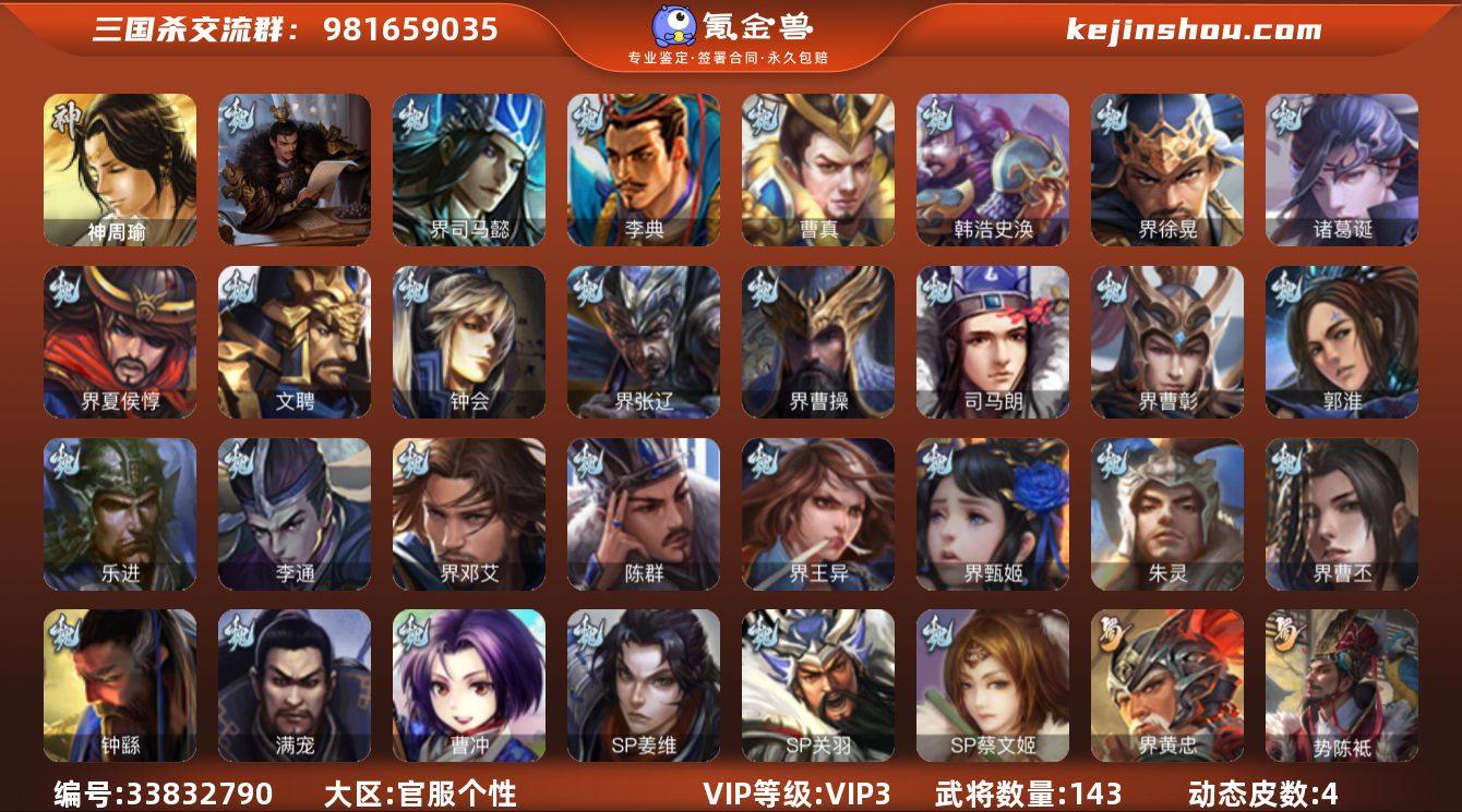 【14790392】官阶:先锋将军;VIP等级:VIP3;史诗武将数量:3;动态皮肤数量:4;武将总数:143;史诗宝珠数量:0;将魂数量:263;神将:0;魏国史诗武将:2;蜀国史诗武将:1;吴国史诗武将:1;群史诗武将:1