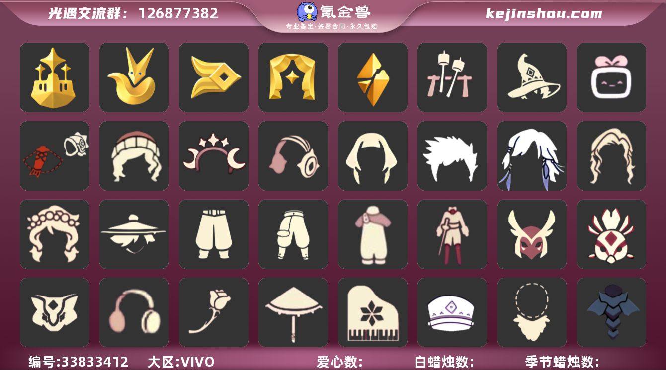 YY0933 vivo渠道【毕业图】晨岛,云野,雨林,霞谷,暮土,禁阁 【毕业季】预言季,风行季,梦想季,表演季,小王子季,破晓季 【蜡烛】188 【爱心】24 【稀有礼包】瑞气服饰,彩虹武士裤,牛仔裤,星月头冠,彩虹耳饰,彩虹耳机,巫树犄角,大蝴蝶结,夏日有友礼包,彩虹帽,巫师帽,玉兔发饰,TGC斗篷黑,创始人斗篷,小王子围巾,星球夹克,鲤跃龙门,蛛网斗篷,白雪斗篷,音韵吉他,情人秋千,花憩茶桌,冥龙南瓜,猫咪背饰,篝火点心,冲浪板,大铁头,大橘大利,福娃礼包 【毕业物品】手拍大鼓,阿努比斯,多羽发饰,蓝黄羽袖,凤凰面具,凤凰斗篷,单边小辫,维京斗篷,帝企鹅发,黄眉企鹅面具,燕尾斗篷,丛林黑面具,双翼遥鲲斗,冥龙斗篷,留辫蘑菇头,粗框眼镜,季卡相机,五塑彩羽发,九色鹿丸子头,小王子发型,小王子套装,玫瑰花 【热门复刻】海洋斗,击剑裤,武士裤,虚荣,正太头,猫猫头,背带裤,搓澡巾,花环长发,红耳机,箬笠,平顶帽,雨伞,高音钢琴,白金斗篷,黑金斗篷,红金斗篷,黄鼠狼面具,女巫发型,失孤发型,樱花发型,星星面具,红吉他,蓝色音乐会,书虫发型,半框眼镜,五周年裤子,道袍/云野/雨林/霞谷/墓土/禁阁/梦想季/小王子季/风行...