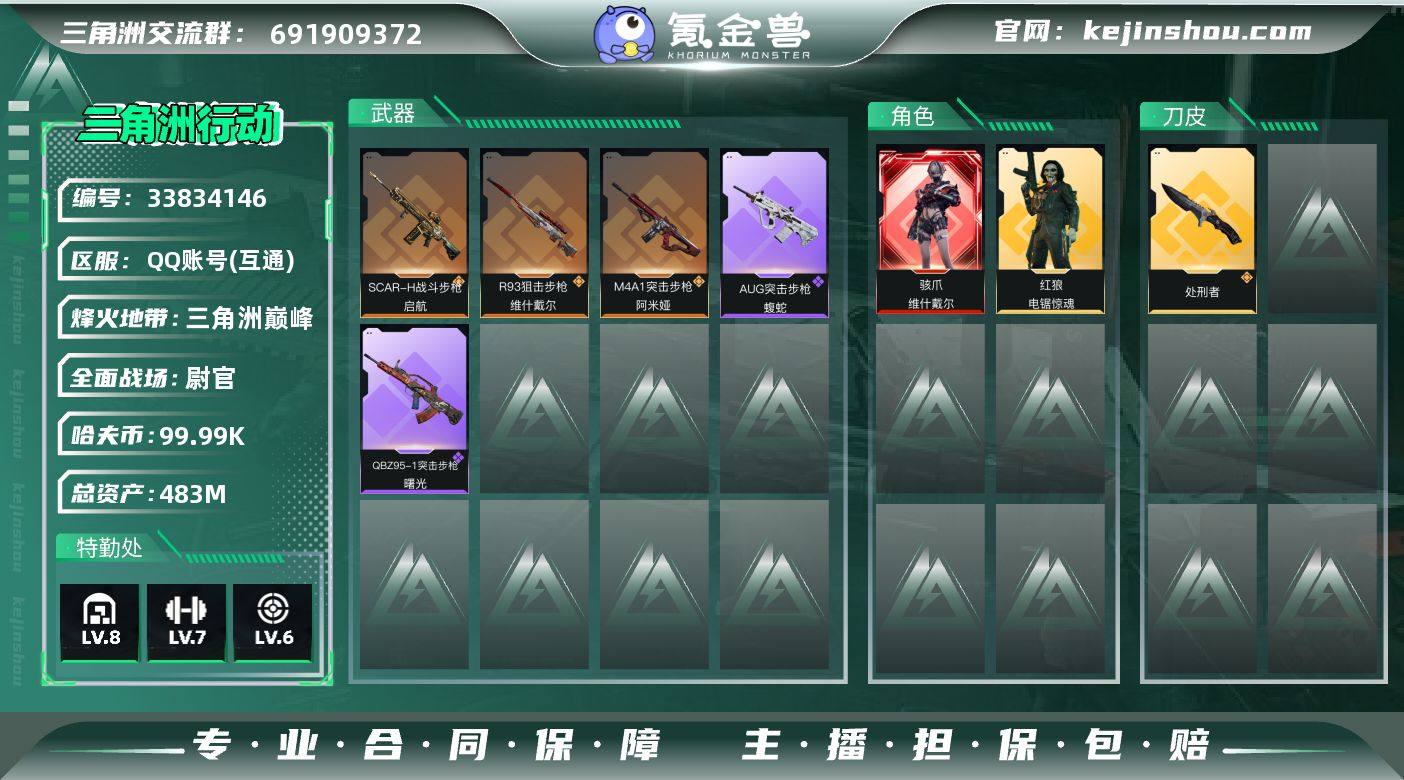 DSJZ1769【富豪号483M资产 309M哈夫币(3个亿)刀皮处刑者 红皮戴尔】三端互通-总价值483.3M-哈夫币309m-烽火地带等级60-烽火地带段位三角洲巅峰【干员皮肤】红狼-电锯惊魂 骇爪-维什戴尔【近战武器】黑鹰 处刑者【枪皮】AKS-74U突击步枪-马赛克涂装 SG552突击步枪-彩墨涂鸦 M7战斗步枪-天际线 AUG突击步枪-千里骏骨 M4A1突击步枪-粉色涂装 M4A1突击步枪-隐秘行动 M4A1突击步枪-高雅黑 M4A1突击步枪-海色 M4A1突击步枪-零点 M4A1突击步枪-阿米娅 AKM突击步枪-肃杀 QBZ95-1突击步枪-高雅黑 QBZ95-1突击步枪-海浪 QBZ95-1突击步枪-海色 QBZ95-1突击步枪-2026 QBZ95-1突击步枪-曙光 AKS-74U突击步枪-冰天雪地 K416突击步枪-几何迷彩 K416突击步枪-高雅黑 K416突击步枪-碳纤维 K416突击步枪-一帆风顺 K416突击步枪-阿萨拉特攻 M16A4突击步枪-高雅黑 AUG突击步枪-浅蓝涂装 AUG突击步枪-蝮蛇 AUG突击步枪-悠然茶歇 M7战斗步枪-红色涂装 M7战斗步枪-黑巧甜心 M7战斗步枪-前沿科技 M7战斗步枪-捣蛋鬼 SG552突击步枪-浅蓝涂装 SG552突击步枪-海浪 SG552突击步枪-狂欢 SG552突击步枪-2026 SG552突击步枪-贴花艺术 SG552突击步枪-深海恐惧 SG552突击步枪-哈夫克警备 AK-12突击步枪-零点 A...