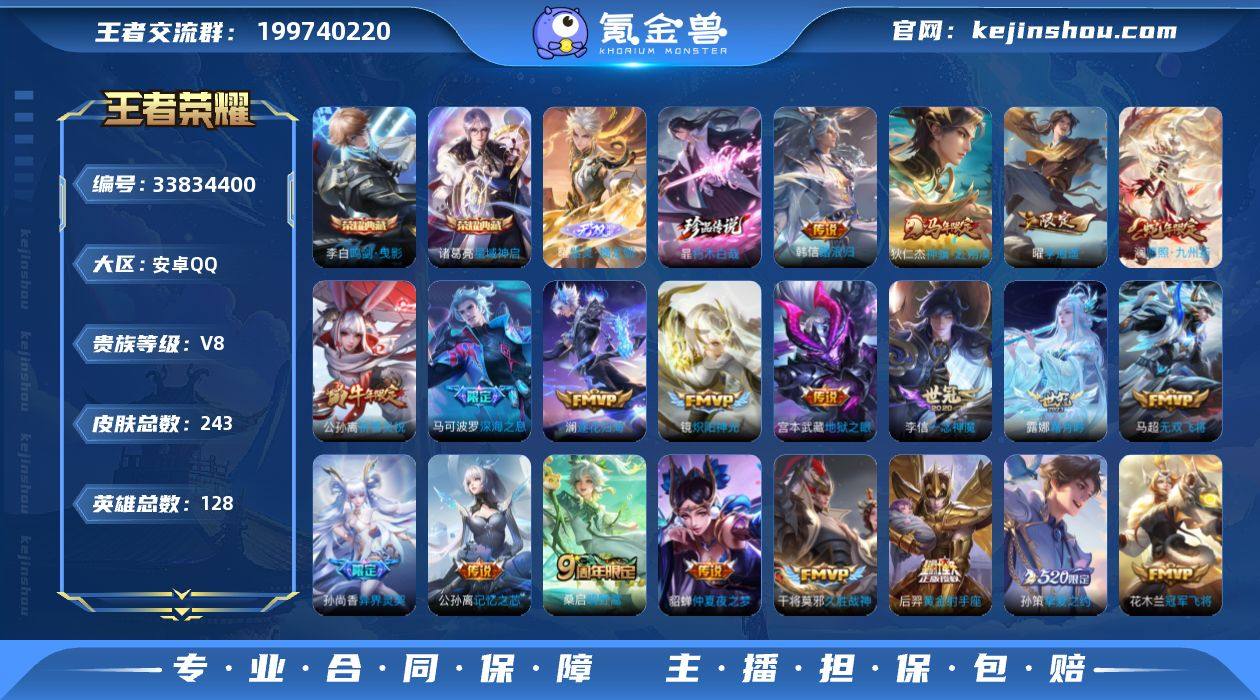 精品皮肤号 限定多多 11王者印记 10按键 5星传说 夺宝次数87 五级铭文150级 亲密度道具 安卓Q-V8-最强王者段位-128英雄-243皮肤-2典藏皮肤-1无双-1珍品传说-23传说-73史诗 【英雄全皮】:孙权全皮,敖隐全皮 【荣耀典藏】:李白鸣剑曳影,诸葛亮星域神启 【无双皮肤】:曜器灵螭龙剑 【珍品传说】:暃朽木白哉 【传说皮肤】:韩信踏浪归,狄仁杰神骥赴朔漠,澜愿照九州拓,桑启鸣野蒿,澜逐花归海,露娜霜月吟,公孙离记忆之芯,马可波罗深海之息,后羿无尽星芒,马超无双飞将,孙策挚爱之约,孙尚香异界灵契,曜李逍遥 ,公孙离祈雪灵祝,铠绛天战甲,镜炽阳神光,虞姬启明星使,李信一念神魔,干将莫邪久胜战神,花木兰冠军飞将,后羿黄金射手座,貂蝉仲夏夜之梦,宫本武藏地狱之眼 【限定皮肤】:姜子牙天穹之誓,狄仁杰阴阳师,赵云皇家上将,赵云百木心枪,孙尚香异界灵契,庄周高山流水,高渐离玩趣恶龙,白起夜都怪侠,芈月幻夜卜梦,元歌无心,马可波罗暗影游猎,马可波罗深海之息,狄仁杰魔术师,达摩沙漠行僧,项羽海滩派对,程咬金演武夺筹,韩信傲雪梅枪,王昭君午后时光,兰陵王金庭之子,花木兰瑞麟志,孙悟空孙行者,后羿圣弓游侠,后羿无尽星芒,李...