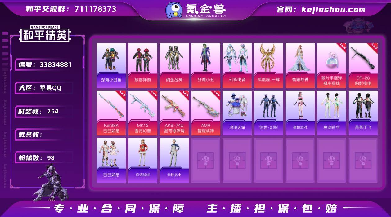 【特价出售】苹果Q-2稀有6粉装7特效枪2热门58套装98枪皮 31166热力值 4印记 历史卓越王牌13星 【2稀有】 AWM-黄金龙骨 浪漫天命 【6粉装】 凤凰座一辉 狂魇小丑 智耀战神 幻彩电音 放客神游 绚金战神 【7特效枪】 AKS-74U-星穹咏叹调 (4级) Kar98K-巳巳如意 (5级) DP-28-豹影疾电 (5级) MK12-雪月幻音 (4级) AMR-智耀战神 (4级) Mk14-福马献瑞 (5级) 破片手榴弹-瓶中星球 (6级) 【2热门】 深海小丑鱼 破蛋小黄鸡 【1头盔】 金羽特工头盔 【1背包】 金羽特工背包