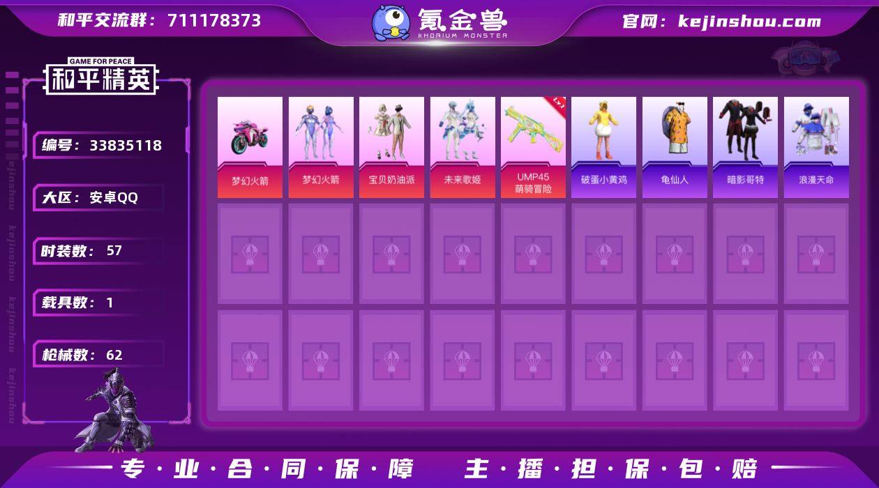 【1载具】双人摩托-梦幻火箭【3粉装】梦幻火箭,宝贝奶油派,未来歌姬【1特效枪】UMP45-萌骑冒险[5级]【2稀有】浪漫天命,暗影哥特1【1飞行器】梦幻火箭飞行器【2头盔】梦幻火箭头盔,童趣迷兔头盔【2背包】甜蜜誓约背包,梦幻火箭背包【113其它衣服和枪皮】老实芭蕉,SS24特训,猛禽,恋语绒绒,冷焰舞者,俏皮奶喵,莱茵河畔,深蓝色名流,花园小羊咩,红釉青花,黑色伏地魔,红色运动,长空猛禽,王牌教练,娇憨猪猪,SS37特训,竞技名士,耀眼新星,冰川特警,清新柠檬,狙击之神,白色伏地魔,暖心橘喵,幻影武者,青玉碎影,龟仙人,阳光菠萝,SS21特训,SS23特训,破蛋小黄鸡,蓝色运动,绯格组合,涂山之恋,锦衣飞扬,魅力单车,惊鸿侠骨,迅捷龙虾,雪兔飞飞,甜蜜告白,蓝彩潮人,荣耀,SS22特训,完美偶像,鹤鸣,SS25特训,灼焰舞者,青涩时光,萌趣咩咩,都市漫游者,龙的传人,黄色运动,雨过天青,AWM-天降萌叽,VSS-彩虹符号,汤姆逊-鸢尾珑雾,汤姆逊-像素花束,蝎式手枪-虹云熊熊,平底锅-惊鸿侠骨,M16A4-雨过天青,DBS-彩虹符号,AUG-天降萌叽,莫辛纳甘-乌木金纹,...
