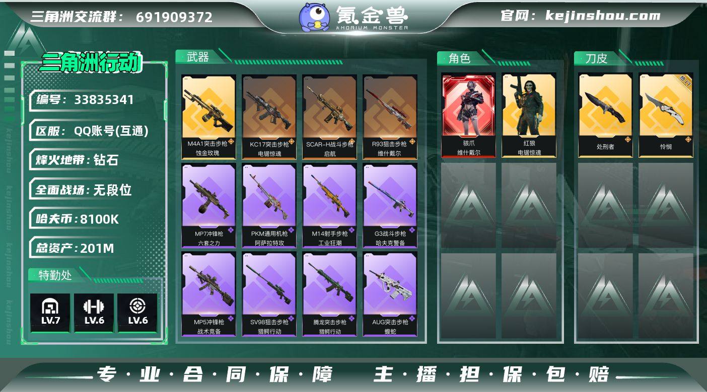 【PTSJZ4281】总资产201M/哈夫币810万/传说近战数1/传说枪皮数4/战场等级5/行动等级60/安全箱等时效性道具以游戏内数据为准,详情请看图/骇爪-维什戴尔/红狼-电锯惊魂/近战-怜悯/近战-处刑者/近战-黑鹰/M4A1突击步枪-蚀金玫瑰/SCAR-H战斗步枪-启航/KC17突击步枪-电锯惊魂/R93狙击步枪-维什戴尔/QBZ95-1突击步枪-曙光/AUG突击步枪-蝮蛇/G3战斗步枪-哈夫克警备/腾龙突击步枪-猎鳄行动/MP5冲锋枪-战术竞备/MP7冲锋枪-六套之力/S12K霰弹枪-曙光/PKM通用机枪-蝮蛇/PKM通用机枪-阿萨拉特攻/M250通用机枪-囚徒/QJB201轻机枪-炽焰/M14射手步枪-工业狂潮/SV98狙击步枪-猎鳄行动/K437突击步枪-巨兽/K416突击步枪-一帆风顺/M7战斗步枪-捣蛋鬼/SG552突击步枪-2026/SG552突击步枪-贴花艺术/腾龙突击步枪-冰天雪地/MP5冲锋枪-哈夫克卫队/P90冲锋枪-黄昏/P90冲锋枪-捣蛋鬼/Vector冲锋枪-先锋/UZI冲锋枪-亚特兰蒂斯/SMG-45冲锋枪-行动开启/SMG-45冲锋枪-幻影结构/勇士冲锋枪-冰天雪地/QCQ171冲锋枪-银鹭/M1014霰弹枪-幻影结构/M249轻机枪-冰天雪地/QJB201轻机枪-哈夫克卫队/Mini-14射手步枪-荣耀列队/G18-星链科技/G18-哈夫克航天/PTR-32突击步枪-噬菌体/M4A1突击步枪-粉色涂装/M4A1突击步枪-...
