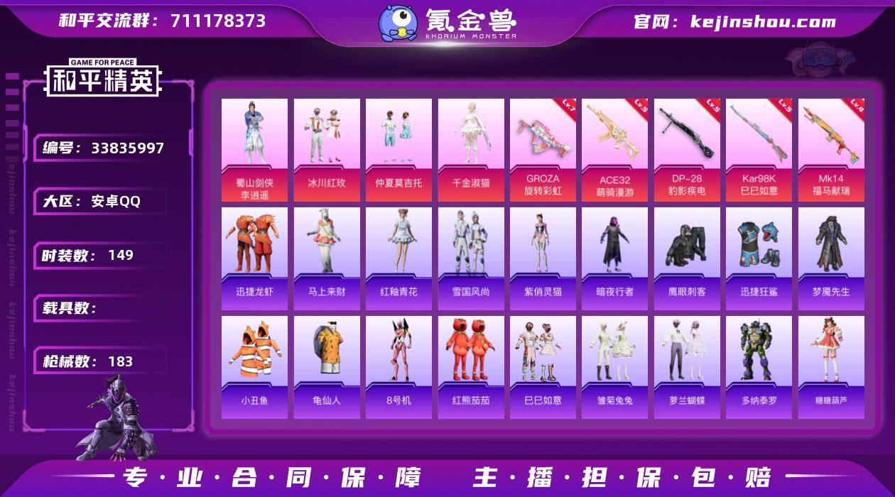 安卓手Q-4粉装-5特效枪-2粉色飞行器-52833热力值-5王牌印记-149套装-183枪皮 【热门品类】:套装-小丑鱼,套装-暗夜行者,套装-龟仙人,角色-8号机,套装-红熊茄茄 【粉色套装】:蜀山剑侠-李逍遥,粉装-冰川红玫,粉装-仲夏莫吉托,角色-千金淑猫 【粉色枪皮等级】:GROZA-旋转彩虹(七级),ACE32-萌骑漫游(五级),Kar98K-巳巳如意(五级),Mk14-福马献瑞(四级),DP-28-豹影疾电(五级) 【粉色枪皮】:GROZA-旋转彩虹,ACE32-萌骑漫游,Kar98K-巳巳如意,Mk14-福马献瑞,DP-28-豹影疾电 【粉色飞行器】:炫彩糖果飞行器,千面幻镜飞行器 【粉色降落伞】:至尊龙雀降落伞,垂柳戏鸭降落伞,彩虹甜喵降落伞,千面幻镜降落伞,旋转彩虹降落伞,第五大道降落伞,未来歌姬降落伞,拂晓神骑降落伞,忍者神龟降落伞,未来领航者降落伞,月影灵韵降落伞,炫彩糖果降落伞 【稀有套装】:套装-龟仙人,套装-巳巳如意,套装-雪国风尚,套装-炫彩糖果,套装-马上来财,套装-迅捷龙虾,套装-雏菊兔兔,套装-萝兰蝴蝶,角色-多纳泰罗,套装-糖糖葫芦,套装-青团波波,角色-俏兔智灵,套装-燕燕于飞,套装-鱼渊荷华,套装-星渊小夜曲,角色-紫俏灵猫,套装-雨过天青,套装-红釉青花 【稀有枪皮...