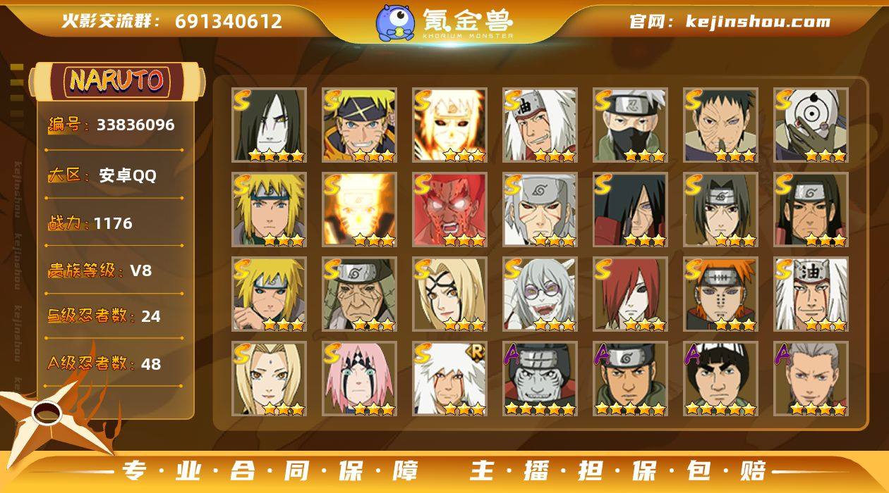 可免费转苹果 V8 1176万战力 24S-48A 日斩98片 秽土半藏80片 LL6007 【S级忍者】:长门「秽土转生」(3星),猿飞日斩「秽土转生」(3星),波风水门「秽土转生」(3星),千手扉间「秽土转生」(3星),千手柱间「秽土转生」(3星),宇智波斑「秽土转生」(3星),春野樱「忍界大战」(3星),宇智波带土「忍界大战」(3星),宇智波鼬「须佐能乎」(3星),旗木卡卡西「须佐能乎」(3星),自来也(3星),自来也「舞之豪杰」(3星),大蛇丸(4星),自来也「传说中的三忍」(3星),纲手(3星),纲手「百豪」(3星),波风水门(3星),药师兜「仙人模式」(3星),漩涡鸣人「九喇嘛连结」(3星),迈特凯「死门」(3星),佩恩「天道」(3星),宇智波斑 「白面具」(3星宇智波斑「白面具」),波风水门「九喇嘛连结」(3星),漩涡鸣人·宇智波佐助(3星) 【A级忍者】:艾「青年」(2星),长门「青年」(2星),波风水门「青年」(2星),达鲁伊「博人传」(2星),迪达拉(2星),迪达拉「秽土转生」(2星),大蛇丸「晓」(2星),奇拉比(2星),奇拉比「忍界大战」(2星),飞段(4星),飞段「死司凭血」(3星),干柿鬼鲛(5星),漩涡鸣人「仙人模式」(2星),漩涡鸣人「九尾查克拉」(2星),迈特凯(5星),旗木卡卡西「万花筒写轮眼」(2星...