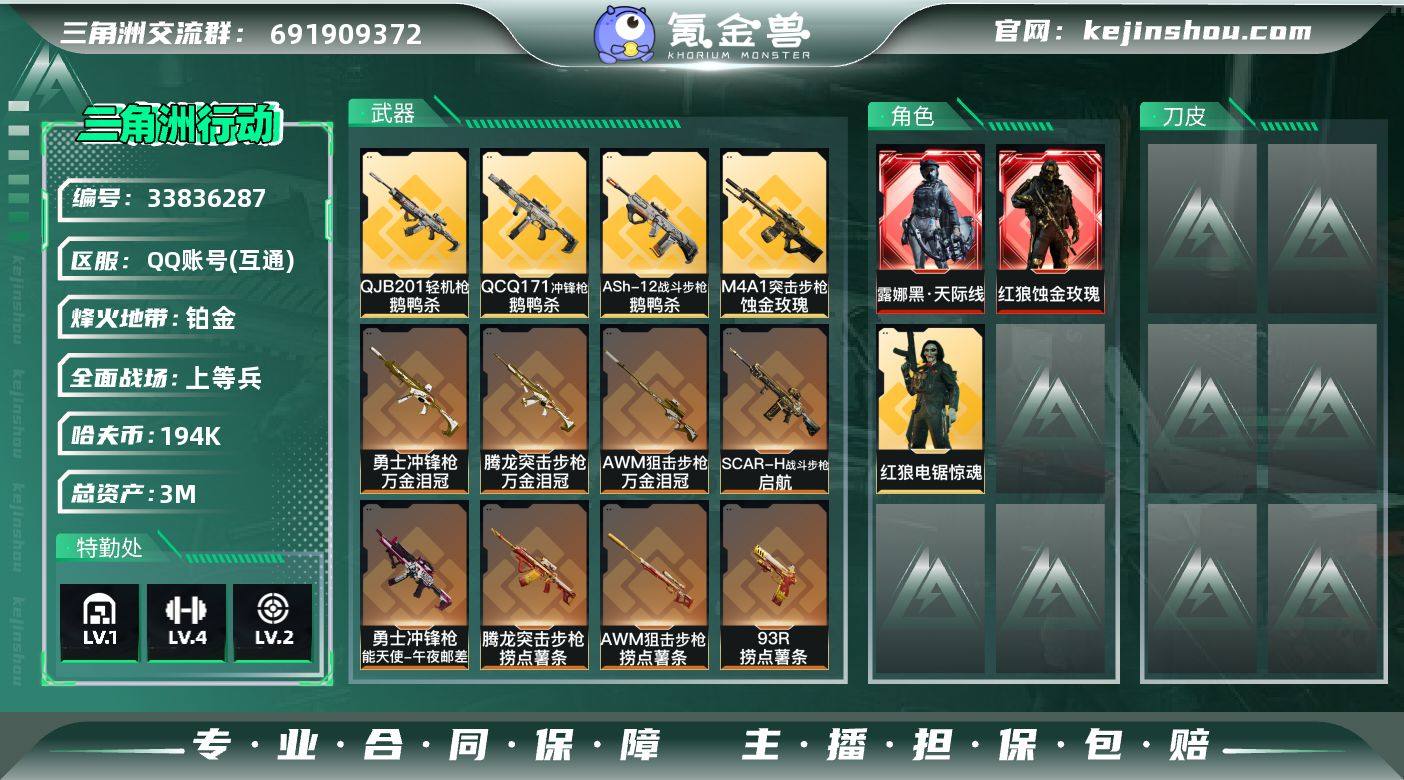 【sjs11230】包人脸 玩够能回血 2红天际线蚀金玫瑰 sjs11230 3m总资产-194k哈夫币-60烽火等级-铂金-23战场等级-上等兵 【干员外观】:红狼-蚀金玫瑰,露娜-黑·天际线,红狼-电锯惊魂 【近战皮肤】:近战-黑鹰 【传说外观】:M4A1突击步枪-蚀金玫瑰,M4A1突击步枪-阿米娅,ASh-12战斗步枪-鹅鸭杀,M16A4突击步枪-狩猎时刻,SCAR-H战斗步枪-水墨云图,SCAR-H战斗步枪-启航,G3战斗步枪-狩猎时刻,腾龙突击步枪-捞点薯条,腾龙突击步枪-万金泪冠,Vector冲锋枪-狩猎时刻,SMG-45冲锋枪-骑士,勇士冲锋枪-能天使-午夜邮差,勇士冲锋枪-万金泪冠,QCQ171冲锋枪-鹅鸭杀,QJB201轻机枪-鹅鸭杀,AWM狙击步枪-捞点薯条,AWM狙击步枪-万金泪冠,93R-捞点薯条,复合弓-黑·天际线 【史诗外观】:AKM突击步枪-林中猎手,QBZ95-1突击步枪-曙光,M16A4突击步枪-竞赛选手,AUG突击步枪-蝮蛇,SG552突击步枪-深海恐惧,SCAR-H战斗步枪-囚徒,腾龙突击步枪-猎鳄行动,MP5冲锋枪-深海恐惧,MP5冲锋枪-战术竞备,P90冲锋枪-紧急戒备,Vector冲锋枪-猎鳄行动,SR-3M紧凑突击步枪-战术竞备,勇士冲锋枪-深海恐惧,勇士冲锋枪-工业狂潮,MP7冲锋枪-六套之力,M1014霰弹枪-林中猎手,S12K霰弹枪-曙光...
