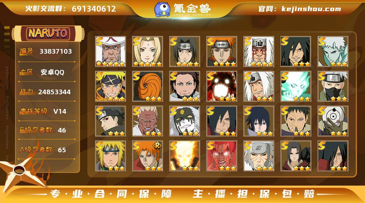 2500w战力本区前10还有很多战力可以升不会掉,连体v8王者,可冲本区前5,马斑十尾都有,高招a30片了,热门氪金a忍一大堆,通灵螃蟹大肠熊猫都有,秘卷不用说了,饰品忍具都是找主播给搞的,忍者方面罗莎小胡子九尾这些热门都有,月卡超影都有超影还剩33天,忍法帖现在230级,无50片,本人就是号主,qq等级低干净无好友专门用来打游戏的,可放心入,我厌烦这个游戏了碰都不咋碰了,上个游戏都觉得恶心放心入