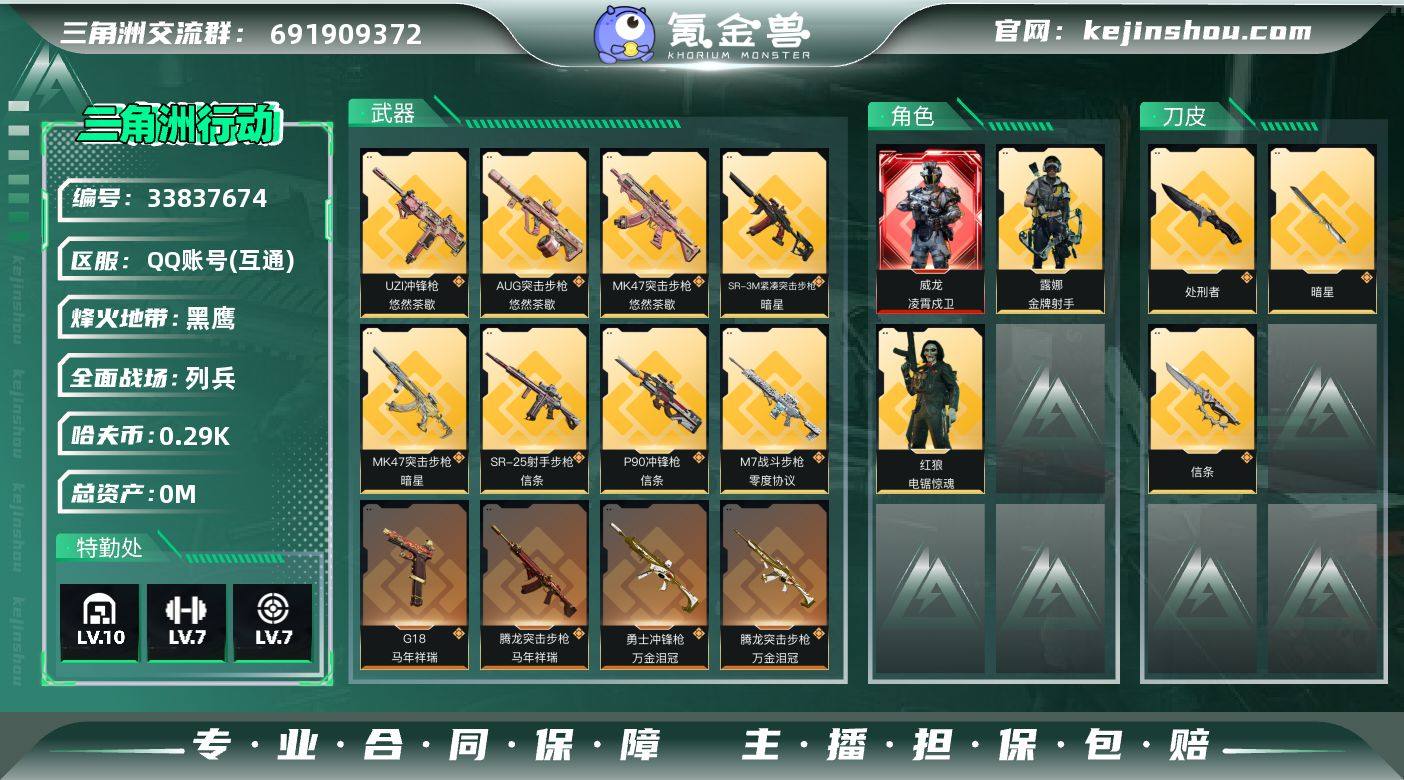 实名: 不可修改 烽火地带段位: 黑鹰 全面战场段位: 列兵 总资产: 182 哈夫币: 293 干员外观: 红狼-电锯惊魂,露娜-金牌射手(S7),威龙-凌霄戍卫 传说武器皮肤: M7战斗步枪-零度协议,KC17突击步枪-电锯惊魂,近战-信条,P90冲锋枪-信条,SR-25射手步枪-信条,SG552突击步枪-运动员,SKS射手步枪-骑士,近战-暗星,MK47突击步枪-暗星,SR-3M紧凑突击步枪-暗星,近战-处刑者,M14射手步枪-蛮荒,K416突击步枪-行动记录,腾龙突击步枪-马年祥瑞,G18-马年祥瑞,勇士冲锋枪-万金泪冠,腾龙突击步枪-万金泪冠,AWM狙击步枪-万金泪冠,.357左轮-缄花,SR-25射手步枪-缄花,M14射手步枪-缄花,SMG-45冲锋枪-锦绣,K437突击步枪-锦绣,AKM突击步枪-锦绣,MK47突击步枪-悠然茶歇,AUG突击步枪-悠然茶歇,UZI冲锋枪-悠然茶歇